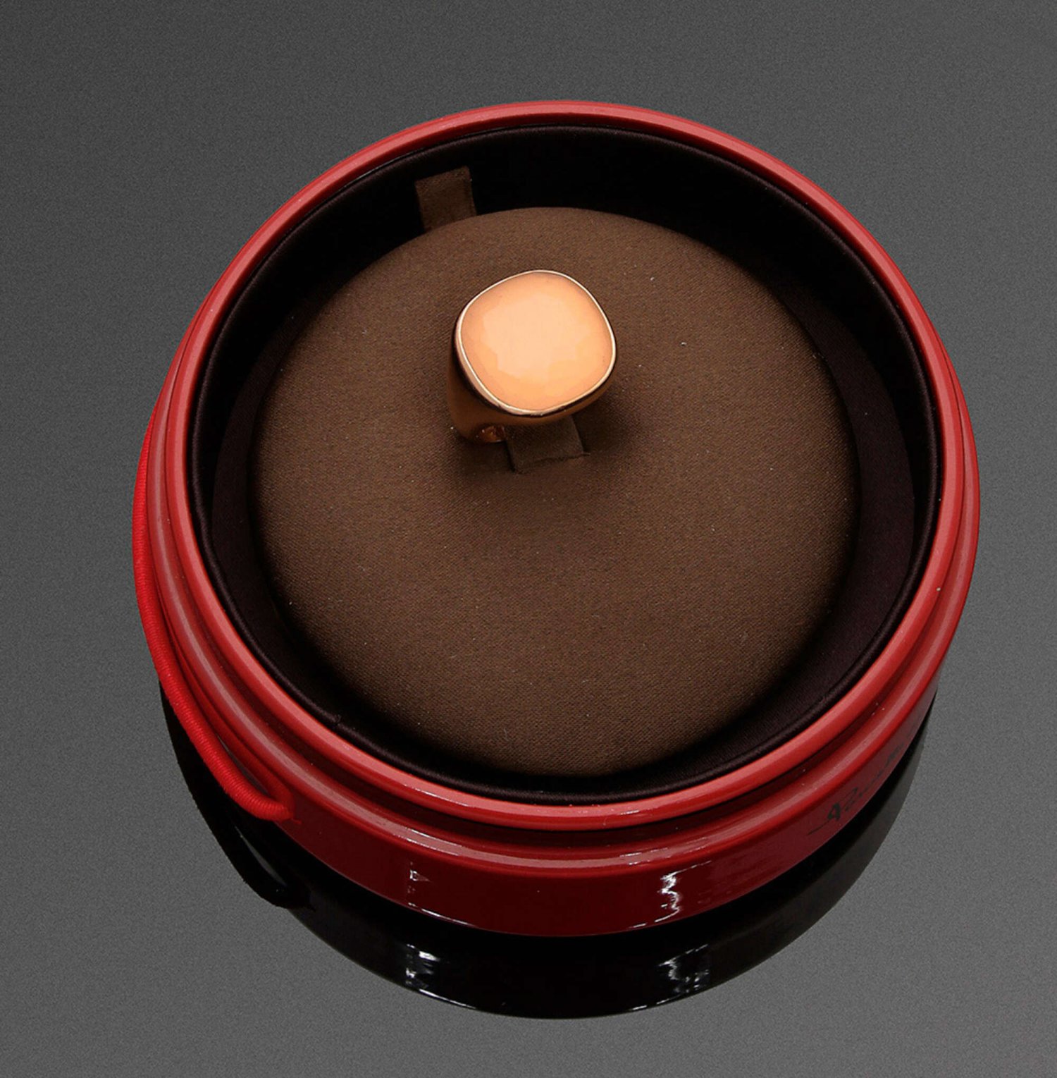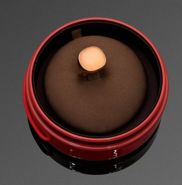 Rosenquarzring von Pomellato aus der Serie "Victoria". Roségold, gest. 750. Zentral besetzt mit einem nudefarbenen Rosenquarz im Briolettschliff. Herstellerzeichen. Gew. ca. 15,02 g. Originale Lackdose.