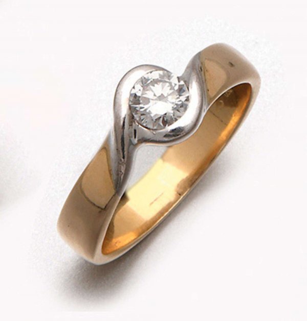 Moderner Brillant-Solitärring Gelbgold, teilw. mit Weißgold verbödet, gest. 750. Zentral besetzt mit einem Brillanten von zus. ca. 0,35 ct. (F-G/vvs). Gew. ca. 4,38 g.