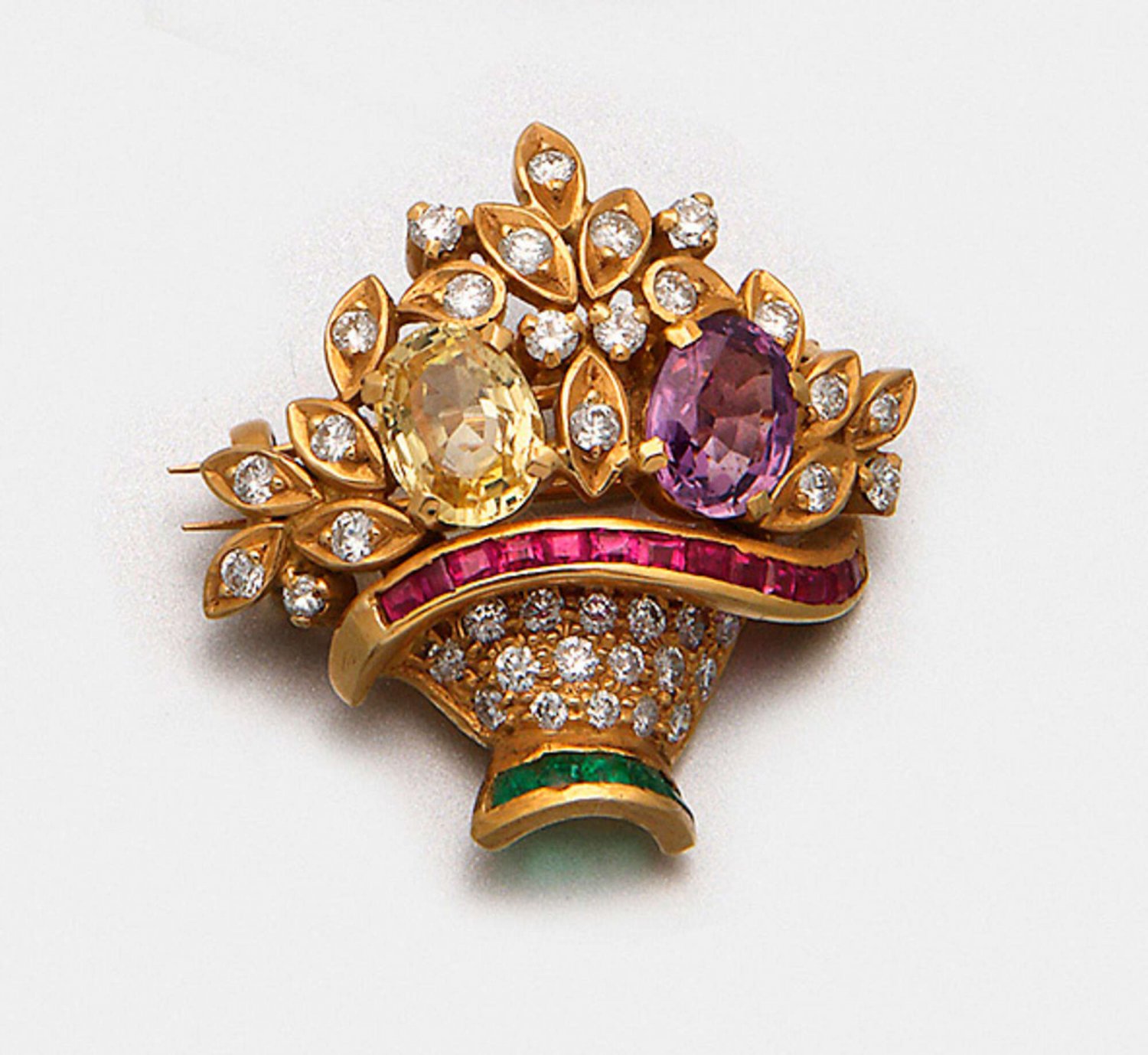Feine Multicolorbrosche Gelbgold, 18 ct. Dekorativ gestaltet in Form eines Blütenkorbes, schauseitig besetzt mit einem fliederfarbenen Amethyst sowie goldgelben Citrin von zus. ca. 2,00 ct., akzentuiert durch kleine Brillanten von zus. ca. 0,60 ct. (H/si). Gew. ca. 8,23 g.