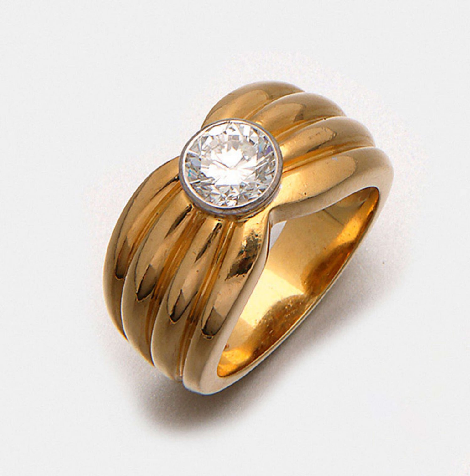Repräsentativer Brillant-Solitärring Gelbgold, gest. 750. Zentral besetzt mit einem Brillanten von zus. ca. 1,55 ct. (H/vvs). Gew. ca. 18,97 g.