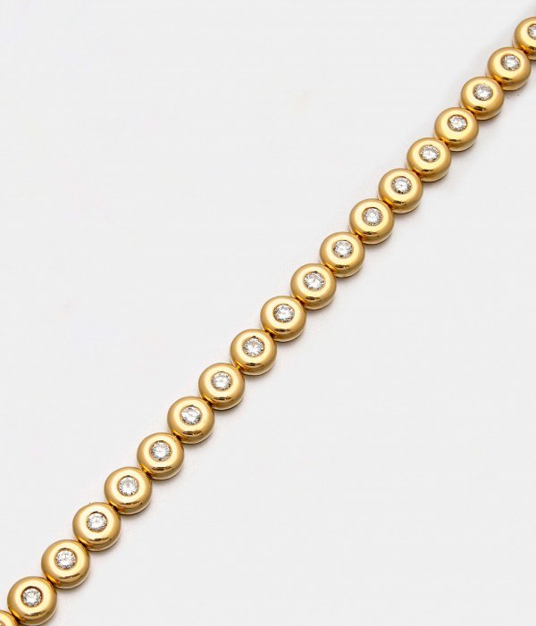 Tennis-Armband mit Brillanten Gelbgold, gest. 750. Schauseitig besetzt mit insges. 20 Brillanten von zus. ca. 5,50 ct. (vvs1-2/vs2/H), in breiter Zargenfassung. Gew. ca. 52,60 g. Sehr schöne Goldschmiedeausführung.