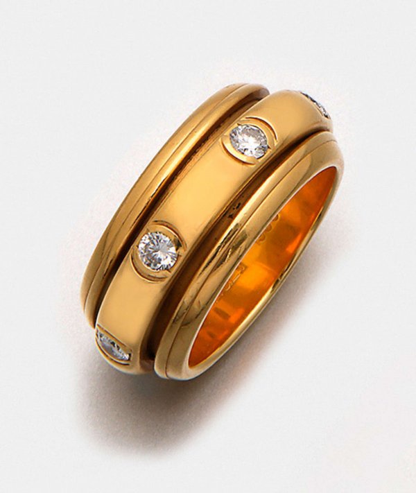 Piaget-Brillantring aus der Kollektion "Possession" von 1990 Gelbgold, gest. 750. Breite, leichte gewölbte, profilierte Bandform, mittig korrespondierender, schmaler, drehbarer Ring besetzt mit insges. sieben Brillanten von zus. ca. 1,05 ct. (F-G/vvs). Herstellerzeichen. Ref.-Nr. A4789060. Gew. ca. 20,61 g. Original Box.