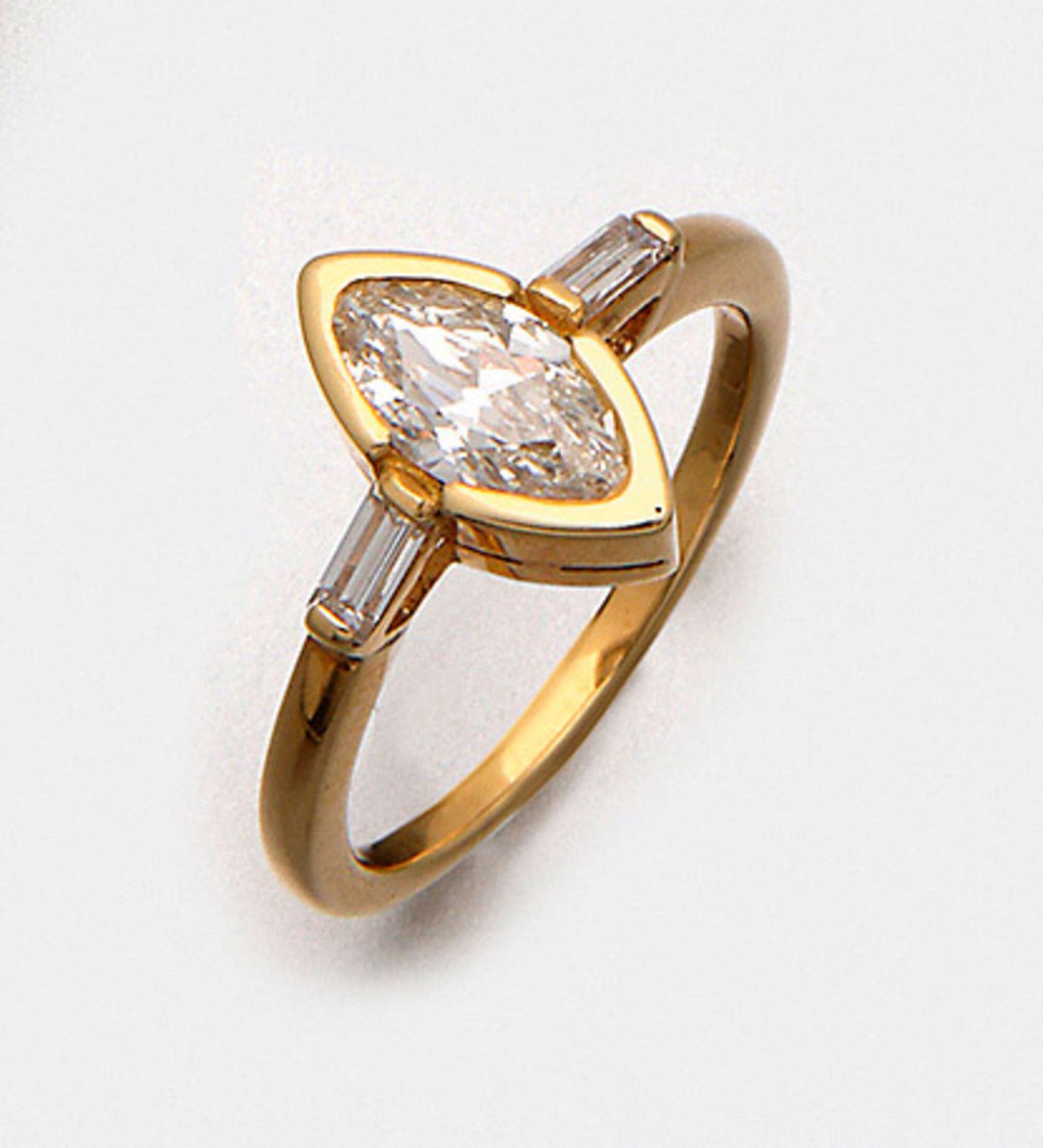 Feiner Marquise-Diamantring Gelbgold, gest. 750. Zentral besetzt mit einem Diamanten im Marquiseschliff von ca. 1,12 ct. (H-J/vs1), flankiert von zwei Diamantbaguetten von zus. ca. 0,05 ct. (H/vvs). Gew. ca. 4,5 g.