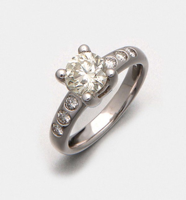 A ring set with a brilliant solitaire approx. 1,60 ct. (J-K/vs) and small brilliants approx. 0,30 ct. (H/vs), in 18 k gold.