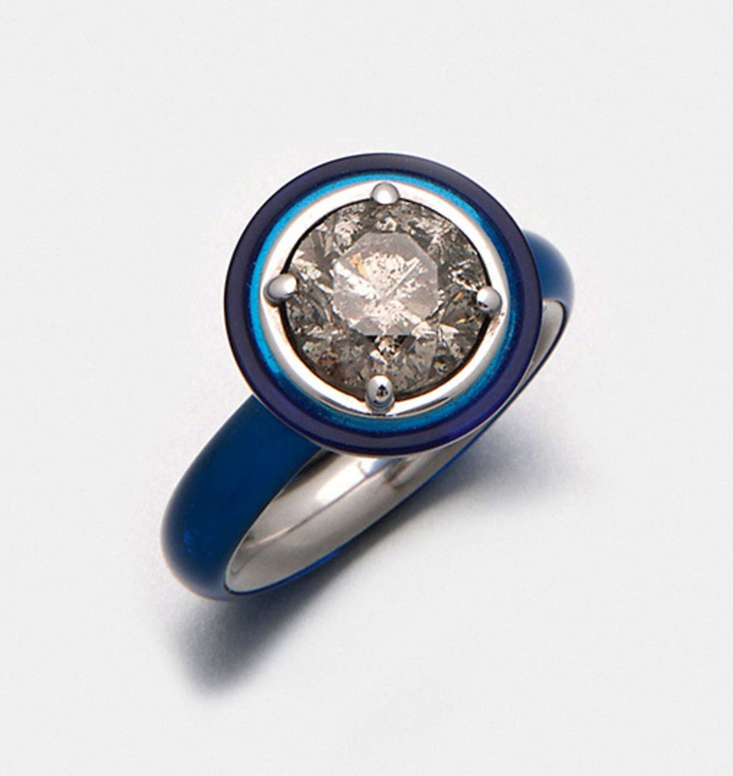 A ring by Gellner "Gibsy Queen", set with a grey brilliant solitaire approx. 3,437 ct. (pi), in 18 k white gold and royal blue glas.