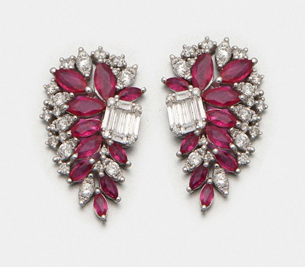 Paar Rubinohrringe im glamourösen Stil der 40er Jahre Weißgold, gest. 750. Schauseitig besetzt mit taubenblutroten Rubinnavetten von ca. 2,50 ct. und Diamanten von zus. ca. 1,40 ct. (G/vs). Ges.-Gew. ca. 6,14 g.