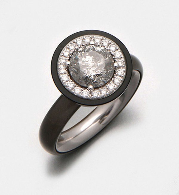 Brillant-Solitärring von Gellner "Gibsy Queen" aus der Kollektion "Brave". Weißgold und dunkelgrau-schwarzes Millenium Glas, gest. 750. Zentral besetzt mit einem grauen Brillantsolitär von ca. 2,06 ct. (pi), entouriert von kleinen Brillanten von zus. ca. 0,20 ct. (F-G/vsi). Ref.-Nr.5-21799-01.