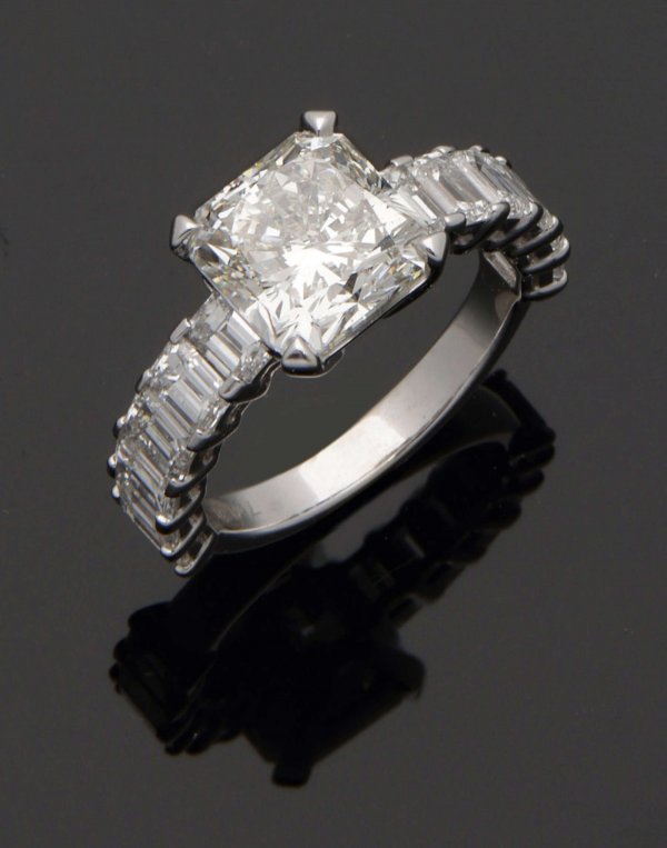 Herausragender hochqualitätvoller Diamant-Solitärring Weißgold, gest. 750. Zentral besetzt mit einem Diamanten im aufwendigen Cushioncut von ca. 4,12 ct. (wesselton(H)/vvs2), flankiert von insges. 14 Diamanten im Emeraldcut von ca. 2,96 ct. (top wesselton(F)/vvs).