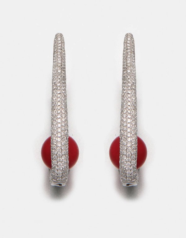 Paar extravagante Diamant-Ohrringe mit Moro-Korallen Weißgold, gest. 750. Schauseitig besetzt mit zwei tiefroten Moro-Korallenperlen und Diamanten von zus. ca. 3,50 ct. (G-H/vs) in Pavéfassung. Gew. ca. 14,77 g.
