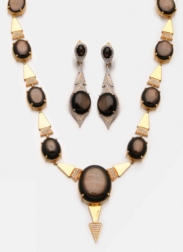 A necklace and a pair of earrings set with anthracite star sapphires approx. 233,1 ct. and white sapphires approx. 1,71 ct. as well as diamonds approx. 0,85 ct., in 14 k gold.