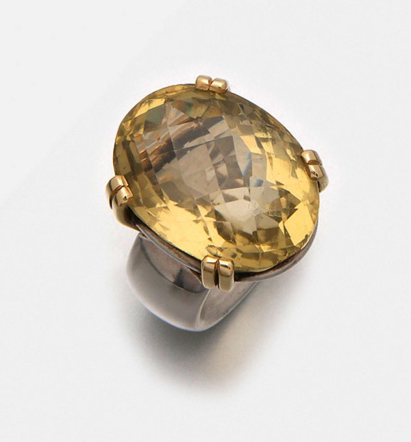 Großer Design "Lemon"-Citrinring Weißgold, gest. 750, teilw. mit Gelbgold verbödet. Zentral besetzt mit einem lemonfarbenen Citrin von ca. 18 ct. im Briolettschliff. Gew. ca. 44,98 g. Sehr schöne Goldschmiedeausführung.