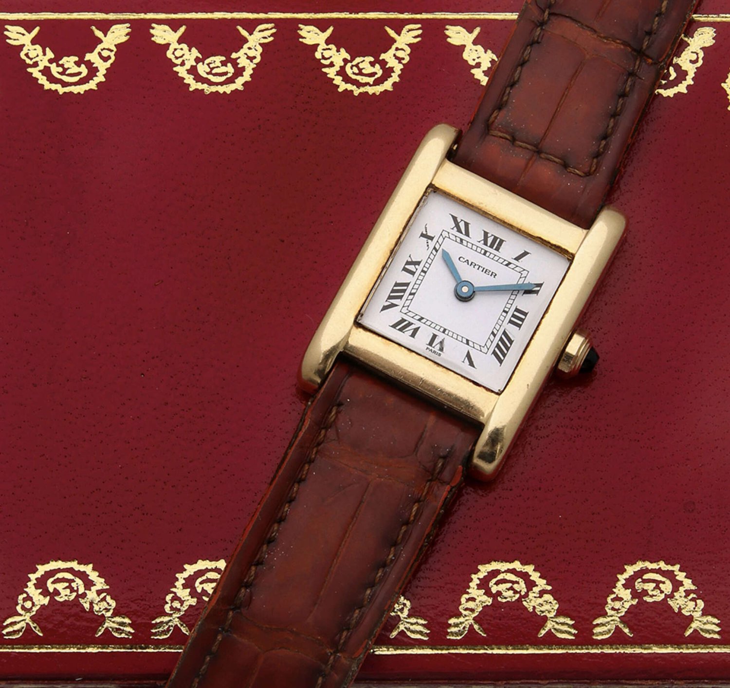 Gelbgold, gest. 750. Tankförmiges Uhrengehäuse, weißes Zifferblatt mit schwarzen arabischen Zahlen und gebläuten Lanzenzeigern. Cognacfarbenes Krokodillederarmband mit C-Spangenschließe in Gold. Mechanisches Werk mit Handaufzug. Ref.-Nr. 780930525. Originales Lederetui. Gew. ca. 19,07 g.