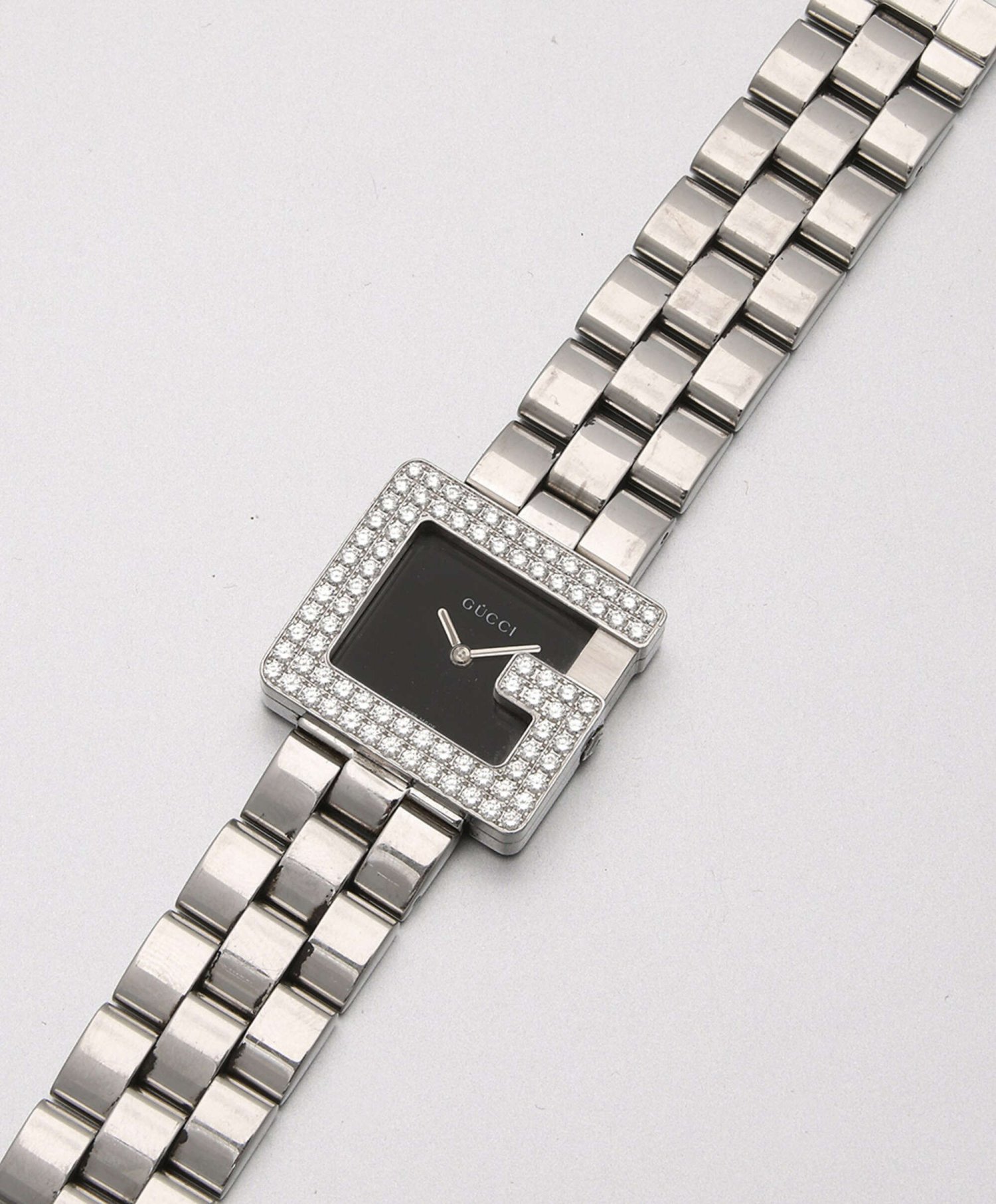 Gucci-Damenarmbanduhr "P" mit Diamanten von 2001 Stahl. Quadratisches Uhrengehäuse, G-förmige Lunette mit Diamanten von zus. ca. 1,62 ct. (G/vvs), schwarzes Zifferblatt mit Lanzenzeigern. Breites Gliederarmband mit doppelter Faltschließe. Quarzwerk. Uhrenpass. Neupreis ca. € 5.000.-.