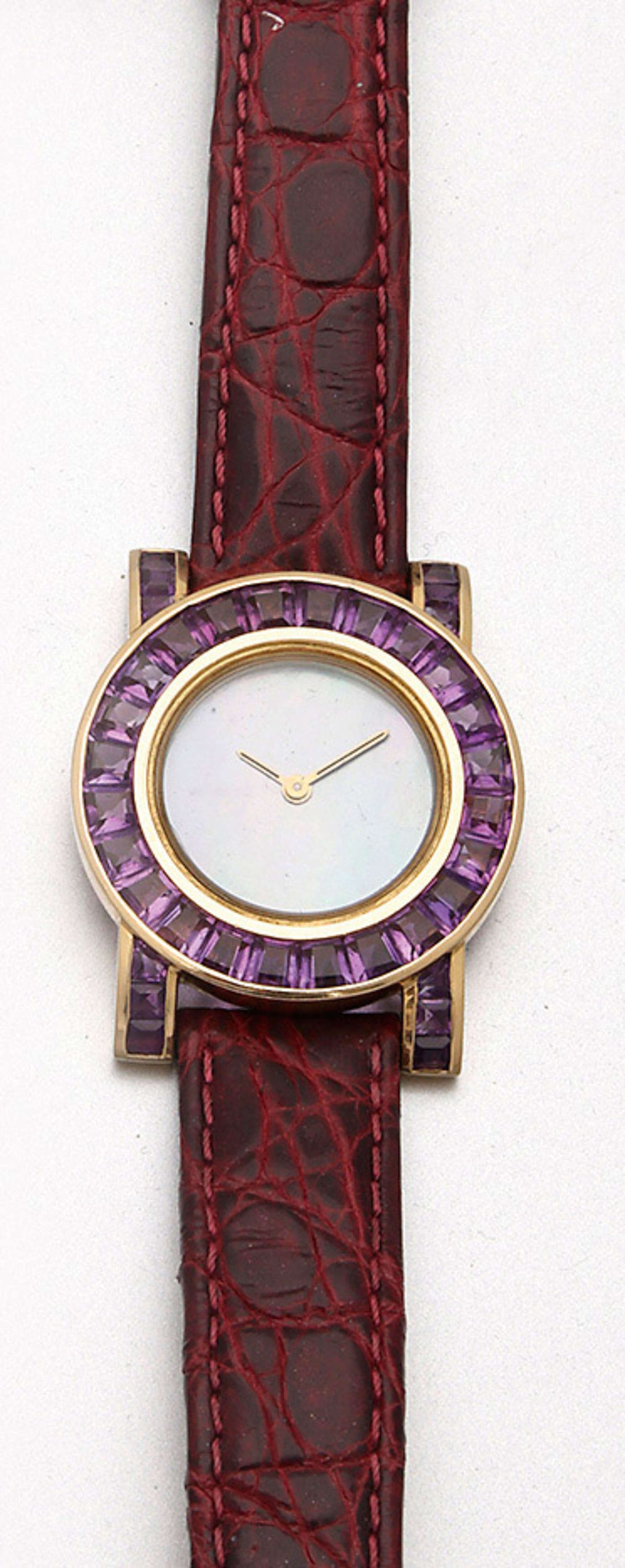 Damenarmbanduhr mit Amethysten Gelbgold, 18 ct.; Rundes Uhrengehäuse, Lunette und Anschläge mit hellvioletten Amethysten besetzt, Zifferblatt aus Perlmutter mit Stabzeigern. Bordeauxfarbenes Krokodilleder-Armband. Quarzwerk. Gew. ca. 26,41 g.