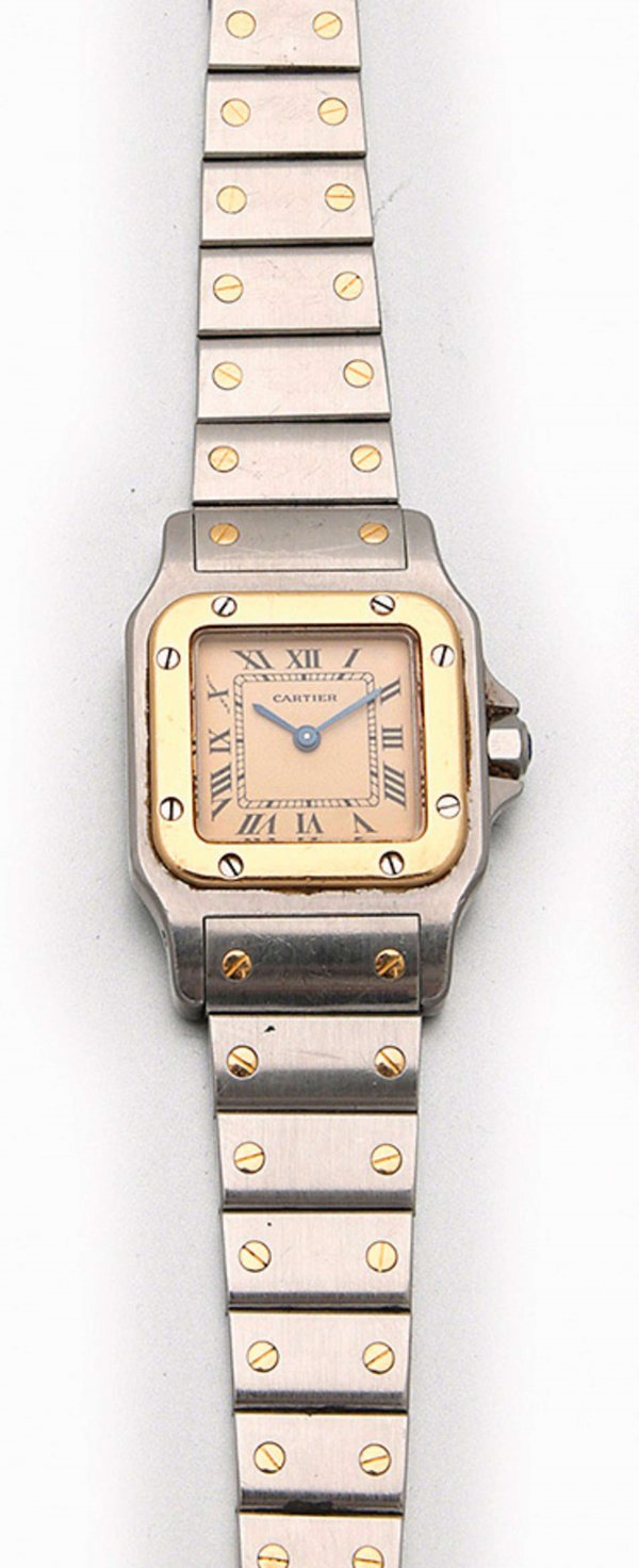 A Cartier lady's wristwatch "Santos de Cartier", quartz movement, in steel with 18 k gold. Manufacturer's mark.