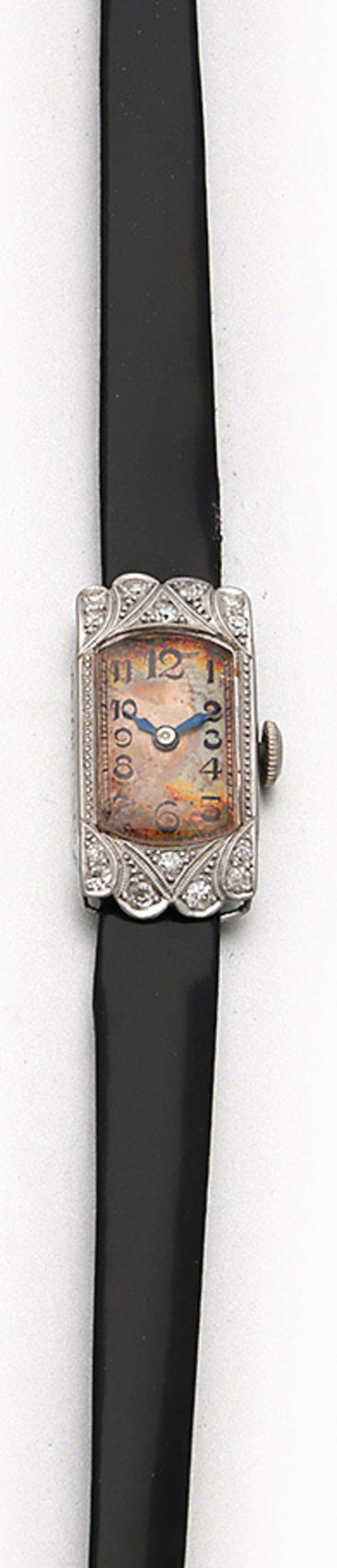 Damenarmbanduhr aus den 40er Jahren Platin. Rechteckiges Uhrengehäuse mit ornamentalem Reliefdekor, besetzt mit Altschliffdiamanten von zus. ca. 0,20 ct., umzogen von feinen Millegriffbändern. Schwarzes Lacklederarmband. Mechanisches Werk mit Handaufzug. Gew. ca. 9,90 g.
