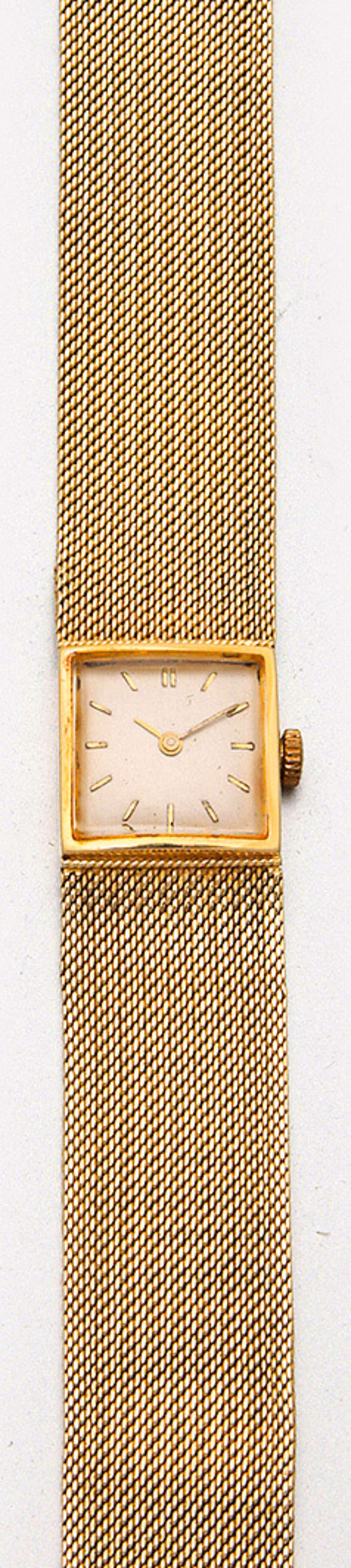 Damenarmbanduhr aus den 50er Jahren Gelbgold, gest. 585. Quadratisches Uhrengehäuse, satiniertes Zifferblatt mit Indexen und Lanzenzeigern. Leicht verlaufendes Milanese-Armband mit Faltschließe. Mechanisches Werk mit Handaufzug. Gew. ca. 99,72 g.