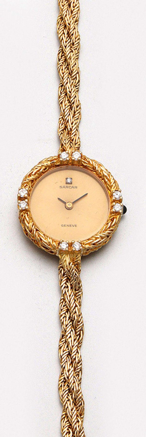 Sarcar-Damenarmbanduhr aus den 90er Jahren Gelbgold, gest. 750. Rundes Uhrengehäuse,umzogen von doppeltem Kordelband, besetzt mit kleinen Brillanten von zus. ca. 0,40 ct.; Korrespondierendes Kordelarmband mit Faltschließe. Quarzwerk. Herstellerzeichen. Gew. ca. 36,84 g.