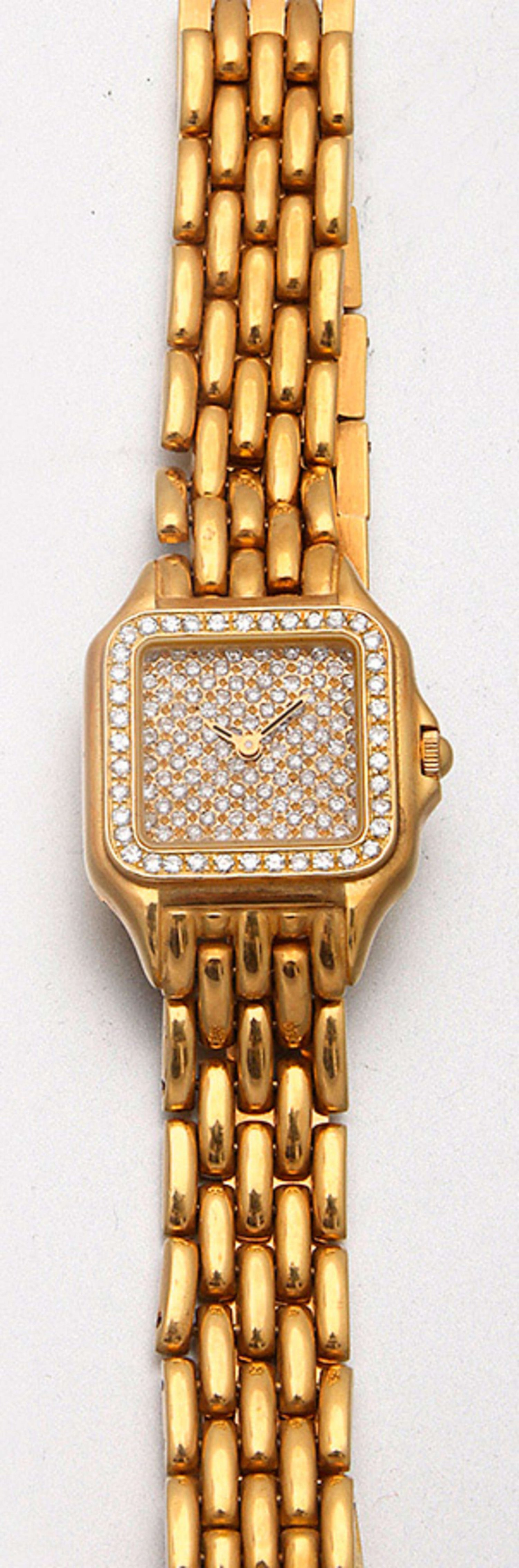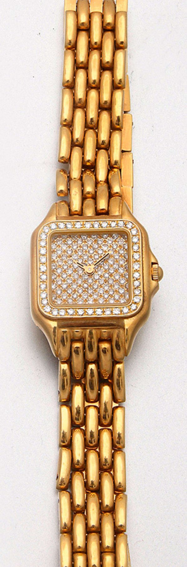 Schmuckarmbanduhr mit Brillanten im Stil von Cartier Gelbgold, gest. 750. Nahezu quadratisches Uhrengehäuse, Lunette und Zifferblatt besetzt mit Brillanten von zus. ca. 1,30 ct. (G-H/vs). Breites Gliederarmband mit doppelter Faltschließe. Quarzwerk. Gew. ca. 59,41 g.