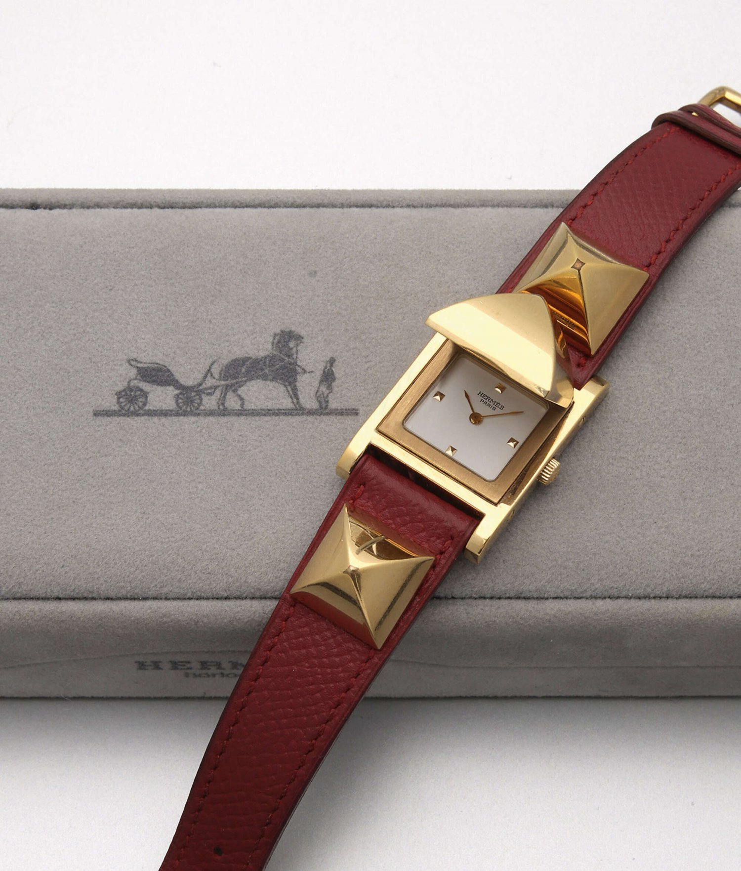 Hermès-Damenarmbanduhr aus der Kollektion "Medor'" von 1996. Messing, vergoldet. H-förmiges Uhrengehäuse mit pyramidenartigem Deckel, flankiert von zwei aufgesetzten, korrespondierenden Gliedern. Fromboisefarbenes Kalbslederarmband. Quarzwerk. Original Etui und Zertifikat.
