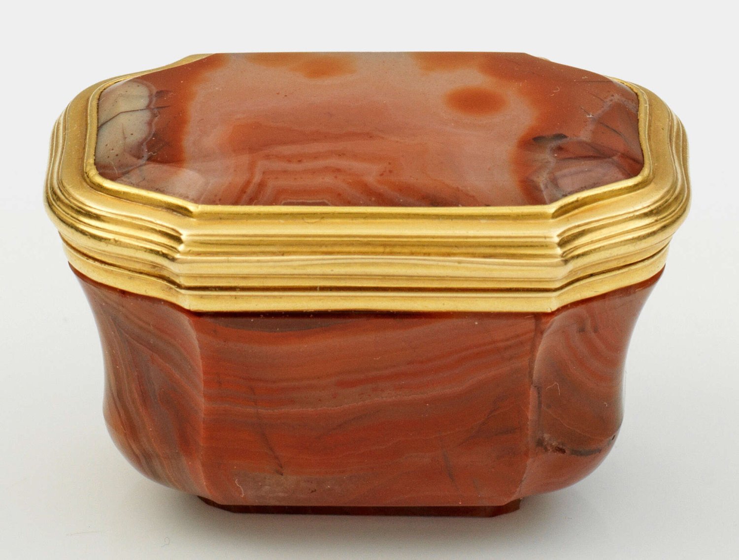 Feine Rokoko-Tabatiere Bandachat, Gold. Nach oben geweitete Sarkophagform mit eingezogenen Ecken und profilierten Randmontierungen. Minim. best; H. 3,4 cm. 3,2 cm x 5,2 cm.