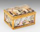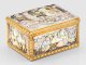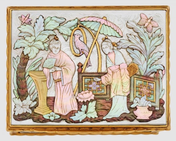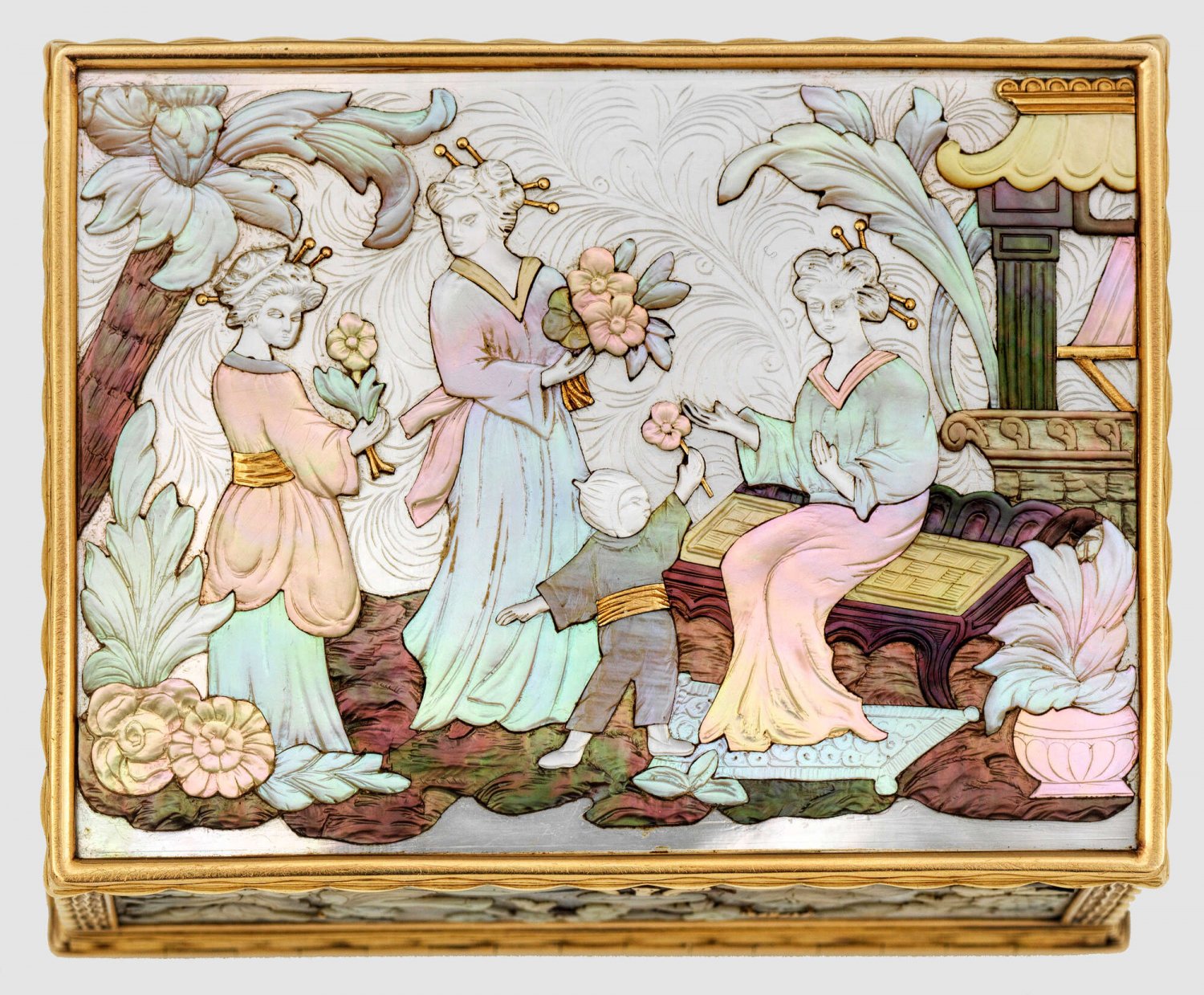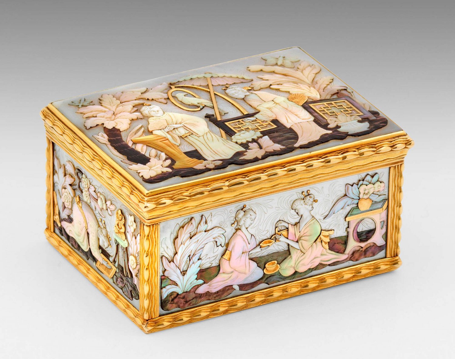 Rechteckige Form mit geflammter Montierung. Allseitiger, flächendeckender, figürlicher, fein reliefierter Dekor aus einzelnen, schichtartig zusammengesetzten, geschnittenen, unterschiedlich farbigen Perlmutter-Elementen und eingelegtem Gold mit detailreich gravierter Binnenzeichnung. Die unterschiedlichen figürlichen Szenen zeigen Chinesinnen und Kinder sowie ein junges Paar in Parklandschaften mit Architektur-Ensembles. Durch die exquisite und kunstvolle Technik mit über- und ineinander geschichtetem Perlmutter wird eine beeindruckende räumliche Tiefe evoziert. Meistermarke von Claude Perron, Beschaumarke von Julien Alaterre und Couronné-Marke mit bekröntem "C". Ges.-Gew. 222,94 g. 4 cm x 8 cm x 6,3 cm.