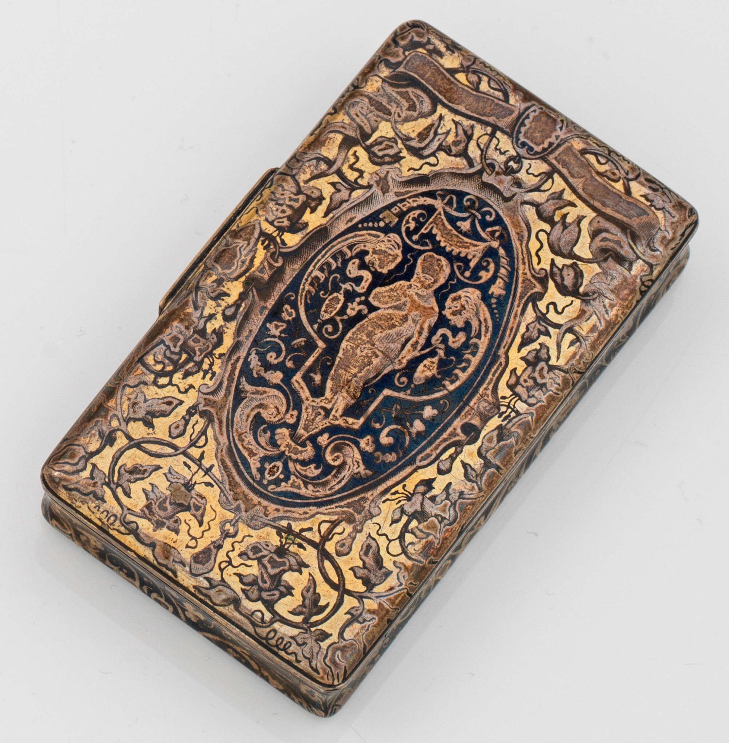Pariser Niello-Tabatiere Silber, nielliert und teilw. vergoldet. Rechteckig mit gebauchter Wandung. Flächendeckender Niello-Dekor aus Blattranken, Blüten und unterschiedlichen Tieren. Auf scharniertem Deckel Ovalkartusche mit der Darstellung Amors. Innen vergoldet. Gest., Beschaumarke, undeutl. Meistermarke. Gew. ca. 100 g. H. 1,7 cm. 8,5 cm x 5 cm.