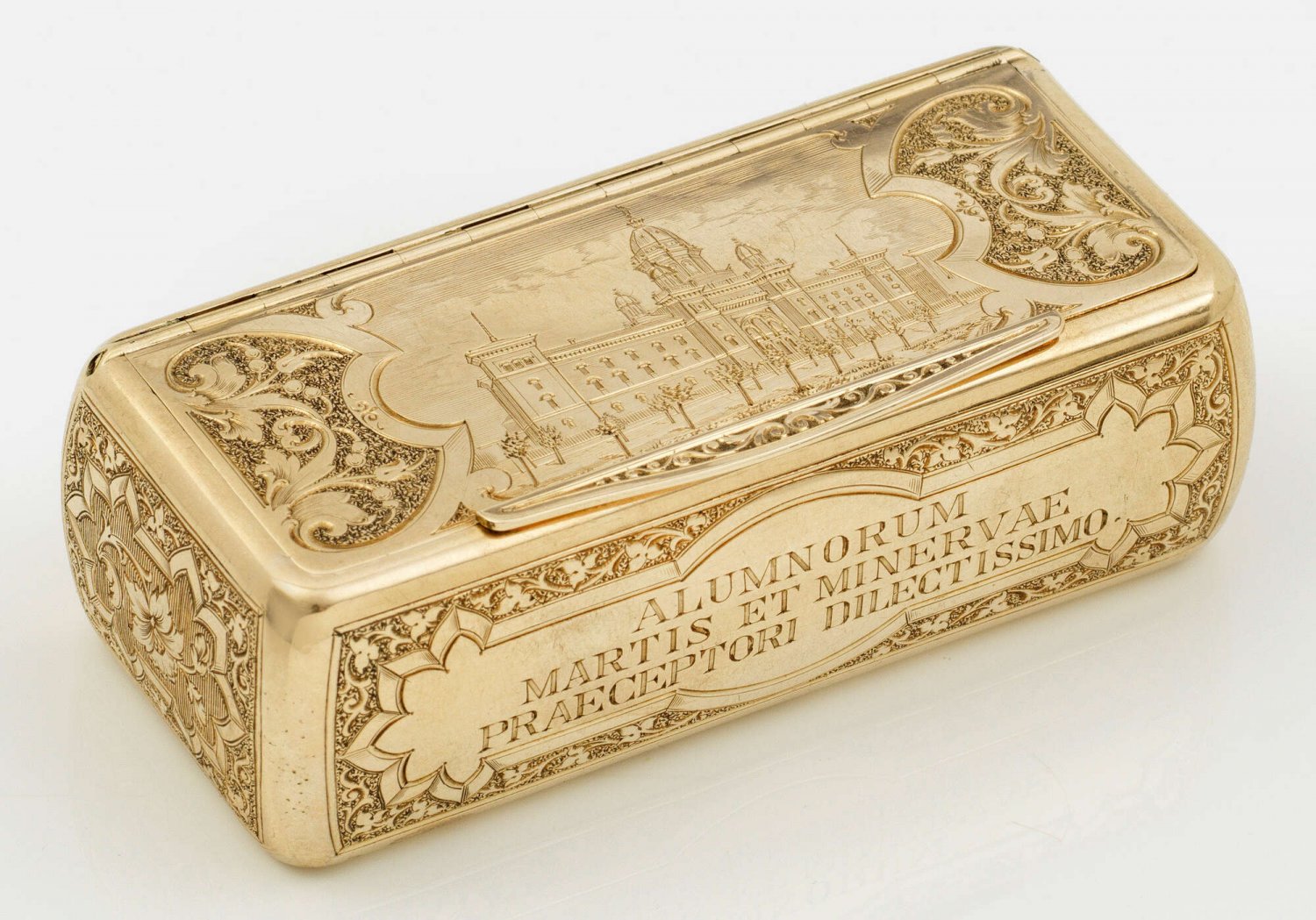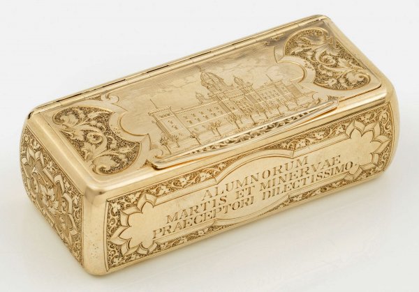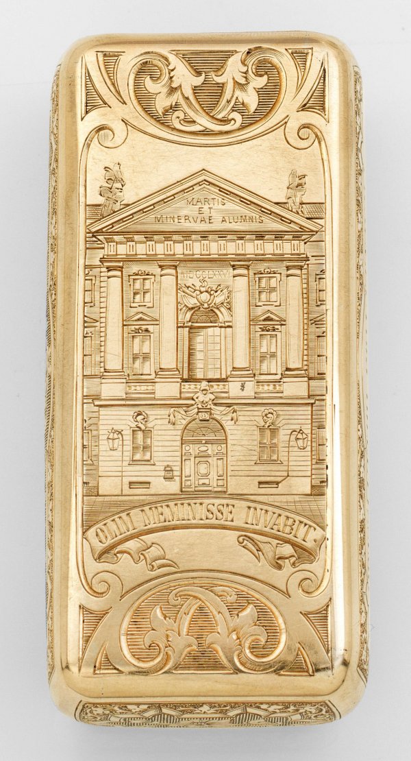 Gold, rechteckiger Korpus mit geschrägten Ecken, überzogen mit filigran gravierten Architekturdarstellungen und vegetabiler Ornamentik. Ober- und unterseitig Ansichten der 1878 nach sechsjähriger Bauzeit fertigestellten Preußischen Hauptkadettenanstalt in Berlin-Lichterfelde. Die Entwürfe für das prachtvolle Backsteingebäude mit Unterrichtsräumen, zwei Kirchen, Feldmarschallsaal und Pferdeställen lieferten die beiden Architekten August Ferdinand Fleischinger und Gustav Voigtel. Auf der Frontseite der Golddose Kartusche mit dem Motto vom Portal der Kadettenanstalt: "Alumnorum martis et minervae praeceptori dilectissimo" (Den Schülern der teueren Meister Mars und der Minerva), auf der Unterseite "Olim meminisse invabit" (Daran werden wir uns erinnern). Als Vorlage diente dieser Sonderanfertigung ein anonymer Holzschnitt aus den 1880er Jahren. Gest. 3572. Gew. ca. 100 g. H. 2,8 cm. 9,1 cm x 4,1 cm.