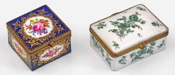 Zwei Tabatieren mit Blumendekor Porzellan. Rechteckige Form mit messingmontiertem Scharnierdeckel. Allseitiger, teilw. auf blauem Fond, in Goldkartuschen gerahmter Blumendekor in kupfergrüner bzw. polychromer Malerei. Teilw. Schwertermarke. H. 3,5 cm. 6 cm - 9 cm x 6 cm - 6,5 cm.