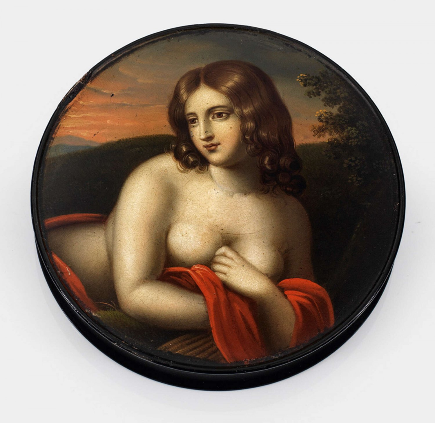 Schnupftabakdose Pappmaché, schwarz lackiert. Rund, mit eingezogener Wandung. Auf dem Deckel Darstellung einer liegenden, unbekleideten Schönheit, bedeckt mit einem roten Tuch. Weiter, baumbestandener Landschaftshintergrund mit Abendhimmel. Im Innendeckel in Hellrot betitelt "Phyllis". Im Innenboden Manufakturmarke in Rot. Polychrome Lackmalerei. Unw. besch.; H. 1,7 cm. D. 9,7 cm.