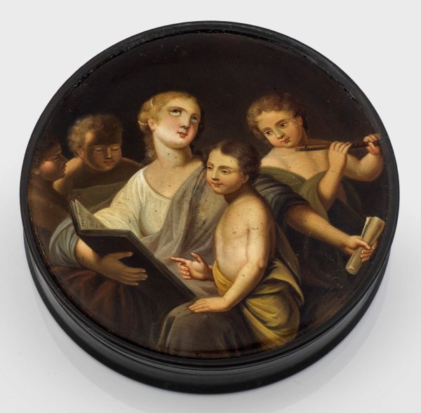 Schnupftabakdose Pappmaché, schwarz lackiert. Rund, mit eingezogener Wandung. Auf dem Deckel mehrfigurige, szenische Darstellung einer jungen, ein Notenbuch haltenden Dame in antikisierender Kleidung beim Musizieren mit vier Kindern als Allegorie der Musik. Wohl nach Sébastien Le Clerc der Jüngere (1676-1763). Polychrome Lackmalerei. Im Innendeckel betitelt "Die Musik nach einer Zeichnung des le Clerk", im Innenboden Manufakturmarke sowie jeweils nummeriert 4208 in Hellrot. Altersgemäße Gebrauchsspuren. Minim. rest.; H. 2 cm. D. 9,4 cm.