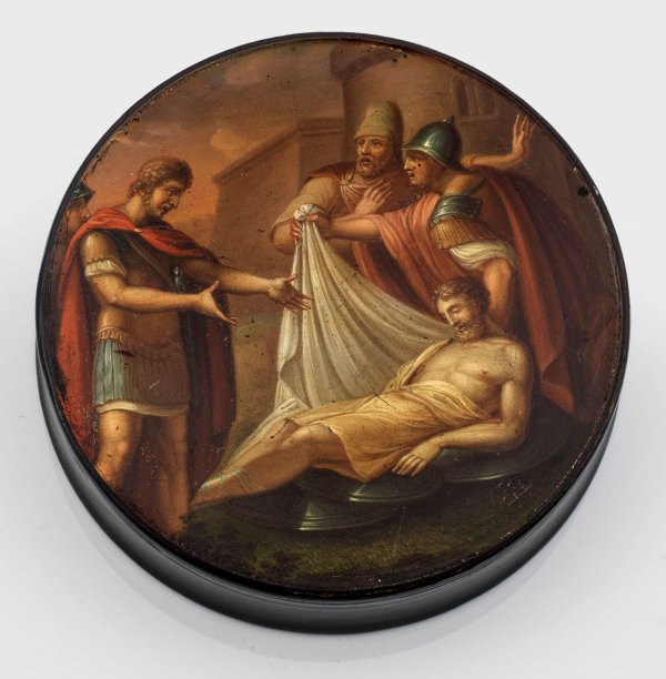 Schnupftabakdose Pappmaché, schwarz lackiert. Rund, mit eingezogener Wandung. Auf dem Deckel szenische Darstellung des vor dem Stadttor sterbenden, von Soldaten betrauerten Feldherrn Codres. Im Innendeckel in hellrot betitelt "Codres stirbt für sein Vaterland". Im Innenboden Manufakturmarke in hellrot. Innendeckel und -boden jeweils nummeriert 3451. Polychrome Lackmalerei. Unw. rest.; H. 2,2 cm. D. 9,4 cm.