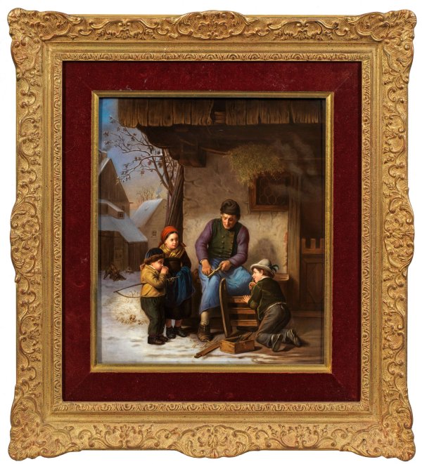 Großes Porzellangemälde Rechteckige Bildplatte mit idyllischer Genreszene in der Art von Felix Schlesinger (1833 - 1910). Vor winterlicher Dorfkulisse, auf einer Bank sitzender Großvater beim Schnitzen von Holz, umringt von seinen Enkeln, ausgestattet mit Schlitten und Angel, ihm aufmerksam bei seiner Tätigkeit zuschauend. Im Hintergrund, vor schneebedeckten Häusern spielende Kinder mit Schlitten. Feine polychrome Malerei. Eingepresste Zepter- und KPM-Marke. Vergoldeter Stuckrahmen mit roter Samtblende. Platte 34 cm x 28 cm. 54 cm x 49 cm.