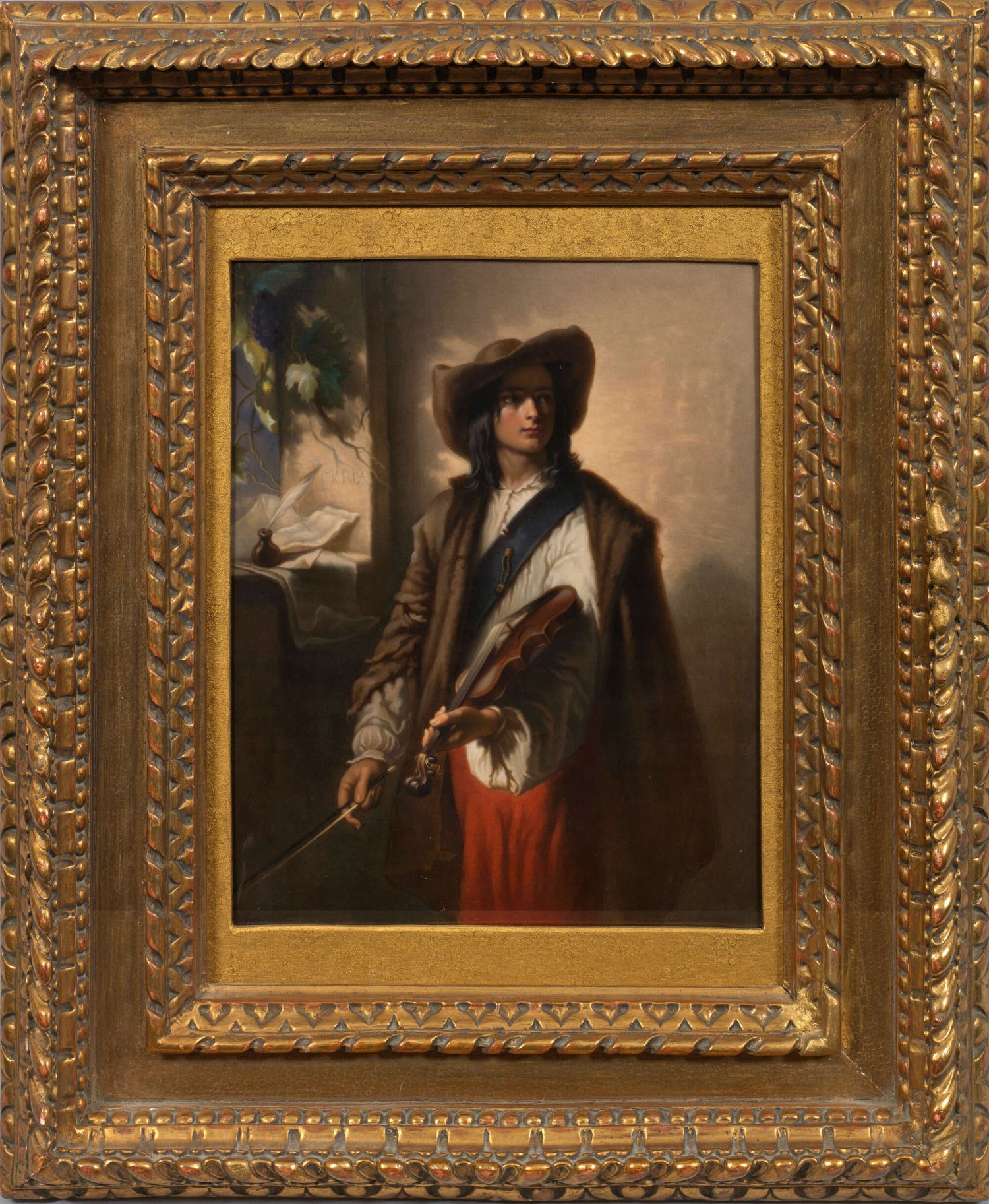 Rechteckige Bildplatte mit der Darstellung eines vor sonnendurchflutetem Hintergrund stehenden jungen Mannes, in den Händen Geige und Bogen haltend. Links auf dem Fensterbrett liegende Notenblätter und ein stehendes Tintenfass mit Feder. Nach einem 1849 entstandenen Ölgemälde des belgischen Malers Louis Gallait (1810 Tournai - 1887 Schaerbeek/Brüssel) in den Königlichen Museen der Schönen Künste in Brüssel (Inv.-Nr. 2567), erworben während der Wiener Weltausstellung 1873. Äußerst feine polychrome Malerei. Zepter- und KPM-Marke. Aufwändiger, ornamentierter Stuckrahmen mit Goldfassung. 31,5 cm x 25,5 cm. 54,5 cm x 45,5 cm.