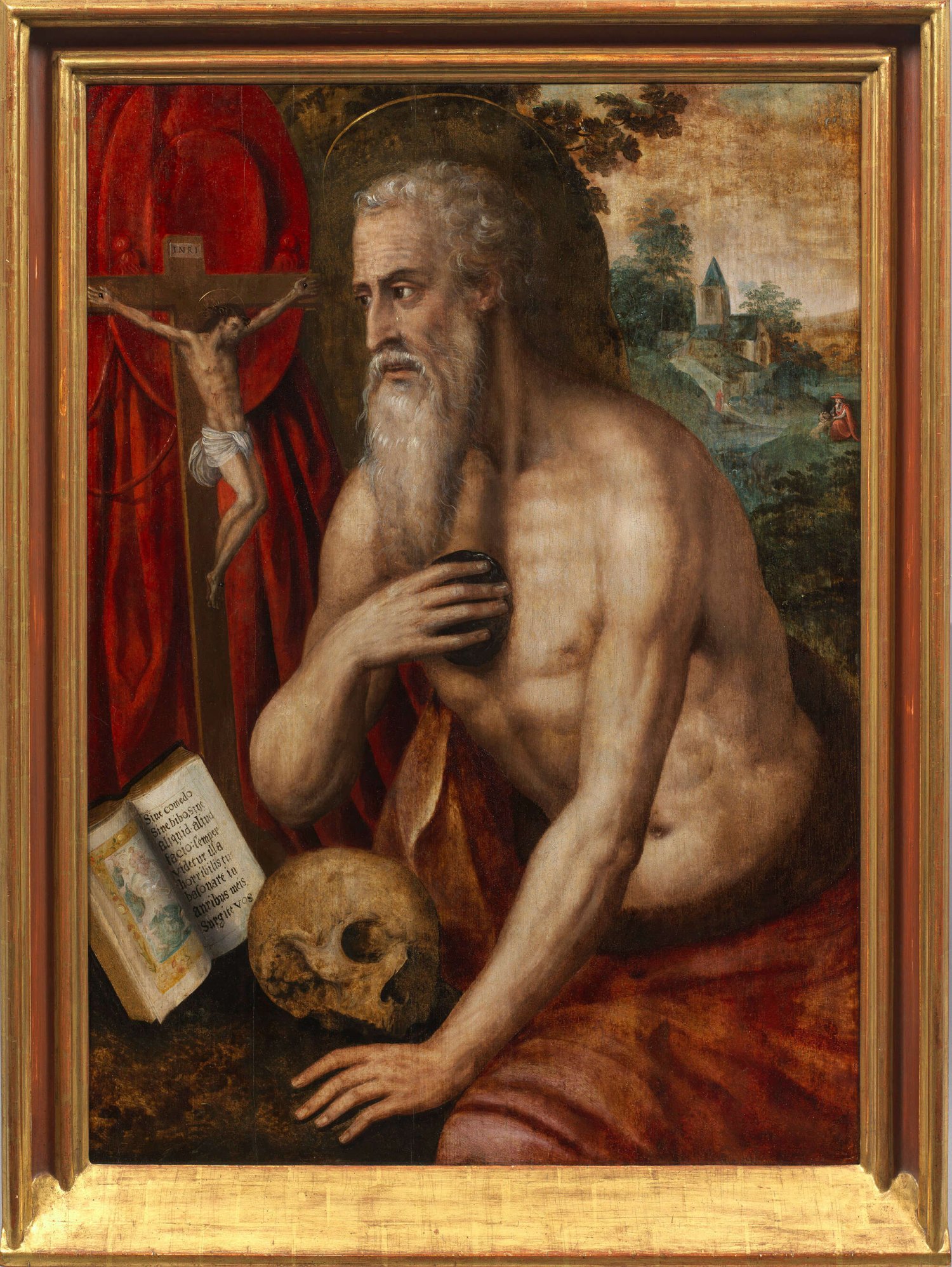 Halbfigurige Darstellung des alten, vollbärtigen Heiligen als asketischer Eremit, der vor einem altarartigen Ensemble aus Kruzifix, Totenschädel und Gebetbuch sitzt und sich mit einem Stein auf die unbekleidete Brust schlägt, an der Wand das abgelegte leuchtendrote Kardinalsgewand. Im Hintergrund Blick auf eine baumbestandene, hügelige Landschaft mit einer Kapelle, neben der Hieronymus ein zweites Mal als kleine Figur (in Kardinalsgewand) mit einem Löwen geschildert wird - den Legenden zufolge soll er einem Löwen einen Dorn aus der Pranke gezogen haben, der darauf zahm und sein treu ergebener Gefährte wurde. Der Körper des Heiligen ist anatomisch getreu wiedergegeben, die ausdrucksvolle Physiognomie des charaktervollen Kopfes wird durch die Darstellung im Dreiviertelprofil in seiner Wirkung geschickt gesteigert. Der Stil und die Komposition des in fein lasierender Malerei ausgeführten Tafelbildes verweisen auf einen Meister der italienischen Schule, der wohl im 1. Viertel des 16. Jhs. in Norditalien (Lombardei/Mailand oder Emilia-Romagna) tätig gewesen sein dürfte. Öl/Holztafel. 90 cm x 65,5 cm. Rahmen.