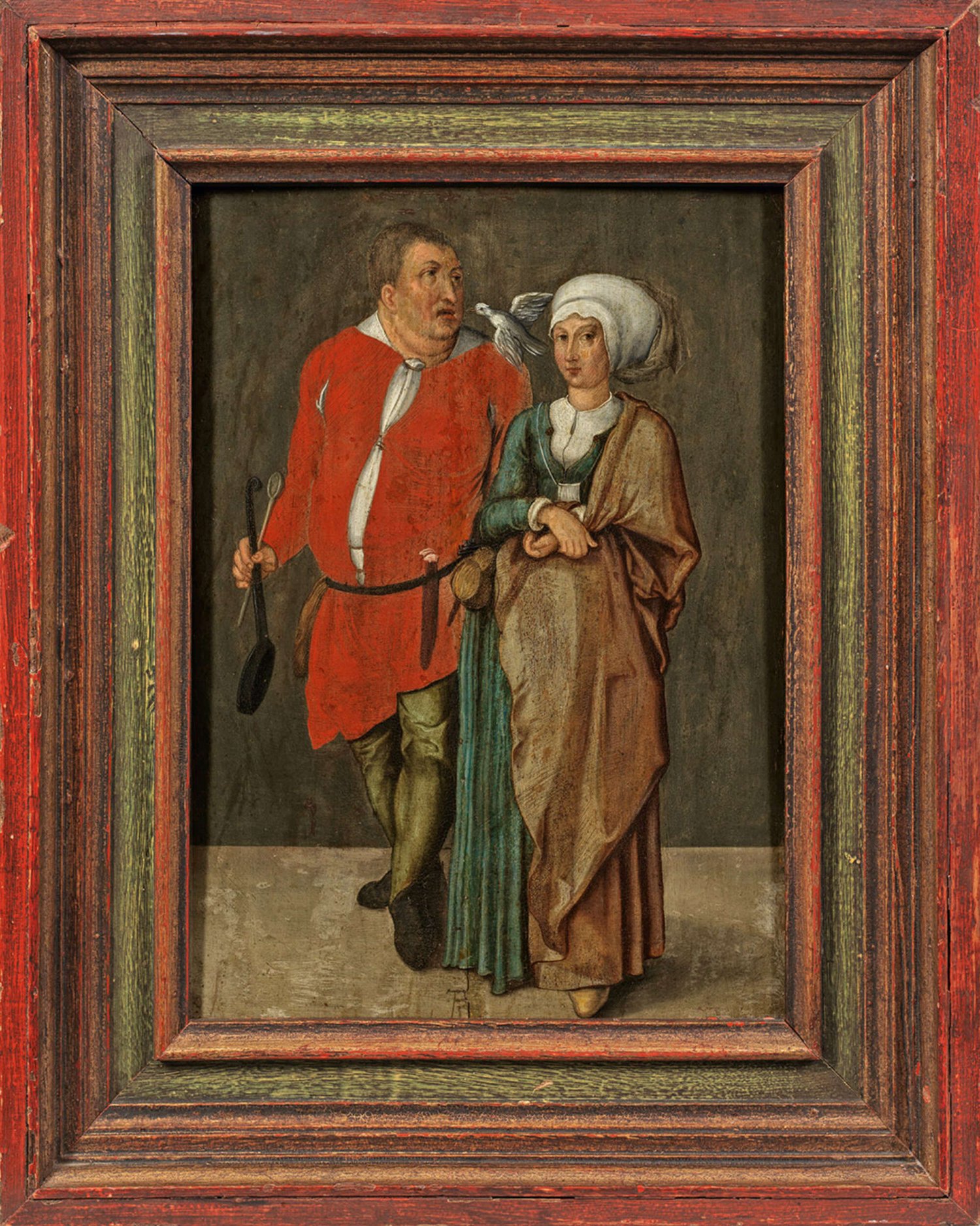 Darstellung nach dem 1496/97 entstandenen, gleichnamigen Kupferstich Albrecht Dürers (Meder 85; Bartsch 84). Geschildert wird ein fast die gesamte Bildfläche einnehmendes stehendes Ehepaar. Der massig wirkende, ältere Mann in Alltagskleidung der Zeit mit weißem Hemd und leuchtend rotem Wams, das sich über seinen großen Bauch spannt. Seinen Kopf nach links gewandt zu einem weißen, taubenartigen Vogel, überdies zu seiner jüngeren, zierlichen, selbstbewussten Frau in bürgerlicher Tracht, wie sie in Nürnberg Ende des 15. Jhs. Mode war; die Schlüssel und Geldbeutel an ihrem Arm weisen explizit darauf hin, dass sie den Haushalt führt. "Der Koch und sein Weib" ist mehr als eine Darstellung eines "ungleichen Paares", sondern überdies auch als Standes- und Geschlechtersatire sowie humoristische Parodie auf männliche Narrheit und "Weibermacht" zu interpretieren. Öl/Holztafel. 35,2 xm x 25,7 cm. Rahmen.