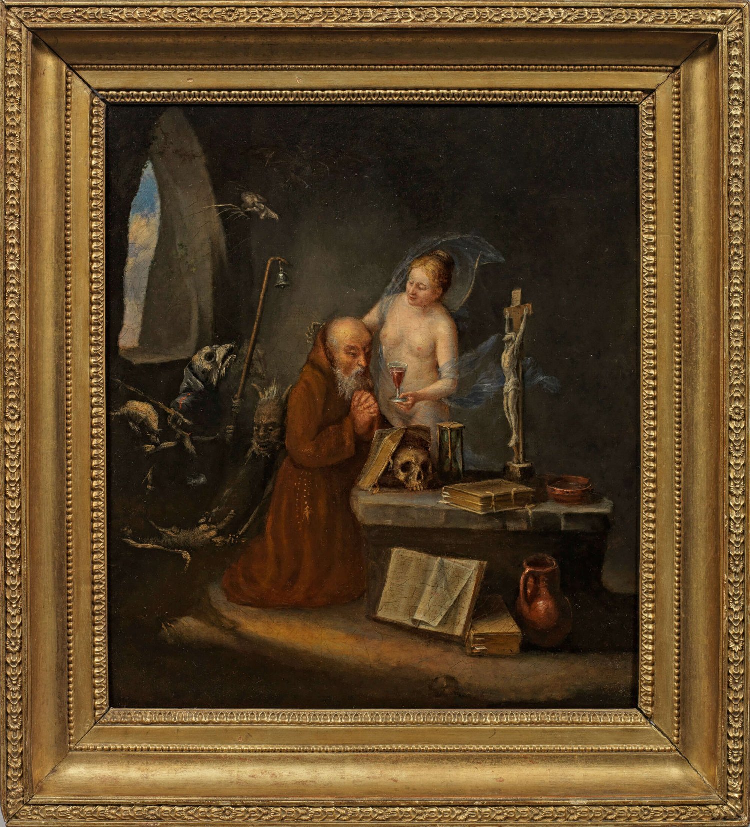 Darstellung des in einer Höhle betenden, vor einem altarartigen Steintisch mit Kruzifix, Totenschädel, Büchern und Stundenglas knienden Eremiten, die Versuchung personifiziert durch eine junge, unbekleidete Frau mit Weinglas und ihn peinigende Dämonen. Mattheus van Helmont wurde in seinen Antonius-Darstellungen von seinem Zeitgenossen David Teniers dem Jüngeren inspiriert. Neben vielfigurigen Szenen in breitem Querformat schuf er auch kompakt komponierte Gemälde, bei denen er den Heiligen vor einem Kruzifix und einem Schädel betend in einer auf wenige Figuren konzentrierten Gruppe darstellte. Öl/Lwd., doubl.; 46 cm x 37,5 cm. Rahmen.