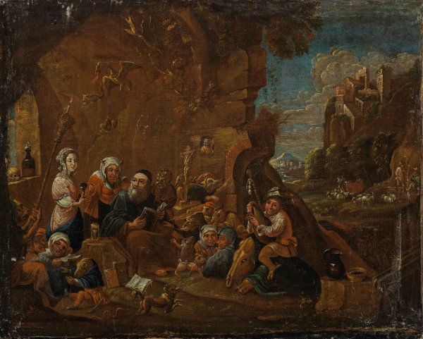 Szenische Darstellung in einer ruinenhaft geschilderten, nischenartigen Einsiedelei, die im Hintergrund auf der rechten Bildseite den Blick auf eine bergige südliche Landschaft mit einem Hirtenmotiv freigibt. Der sitzende, von einem Stundenglas und einem Kruzifix flankierte Heilige wird von einer jungen Frau mit Weinglas sowie einer alten, gehörnten Frau verführt und hierbei von weiteren Teufeln nebst diversen dämonischen Mischwesen aus Mensch und Tier umringt. Wie kaum ein anderer hat David Teniers seit ca. 1632 höchst fantasiereich in einer umfassenden Werkreihe das Antonius-Thema zum Motiv einer größeren Werkreihe gemacht, womit er viele Maler wie Franciscus Carré, Mattheus van Helmont und Egbert van Heemskerck (II) beeinflusste. Öl/Lwd., alt auf dünnen Karton kaschiert. Restaurierungsbedürftig. 61 cm x 76,5 cm.