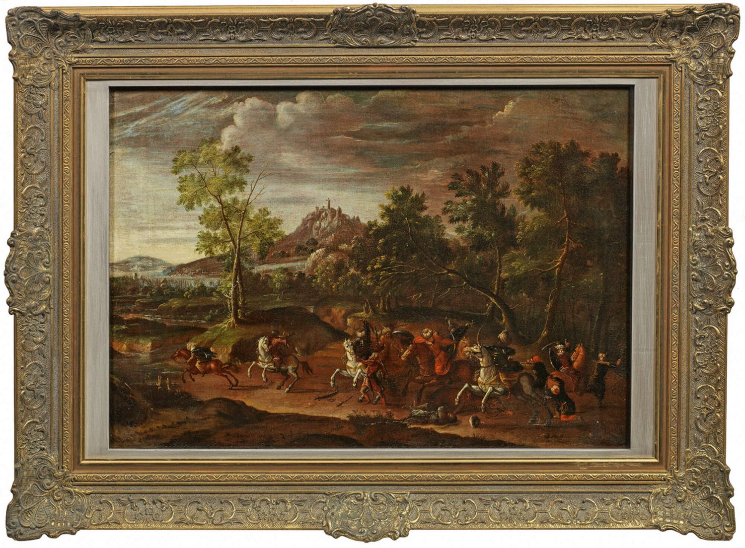 Szenerie in phantasievoll geschilderter, bergiger, baumbestandener Landschaft, im Vordergrund ein tobendes Reitergefecht, im Hintergrund eine Burg auf einem hoch aufragenden Berg. In Motiv, Stil und Komposition charakteristisches Werk des Künstlers, das durch seine ikonographisch höchst außergewöhnliche Gefechtsszene mit Mohren herausragt. Frederik de Moucheron lernte um 1650-1655 in Amsterdam bei Jan Asselijn; in einem Intermezzo war er bis 1659 in Frankreich tätig, reiste nach Deutschland, Italien und sehr wahrscheinlich auch nach Griechenland und Marokko - diese biographische Episode dürfte ihn zu der Gefechtsszene im Vordergrund inspiriert haben. Nach seiner Rückkehr schilderte er italienisierende und baumreiche Landschaften mit Jagdgesellschaften, Hirten und Reitern, deren Figurenstaffage oft von bedeutenden Künstlern wie Adriaen van de Velde, Nicolaes Berchem, Johannes Lingelbach und Jan van Huchtenburg stammt. Öl/Lwd.; 60 cm x 83 cm. Rahmen.