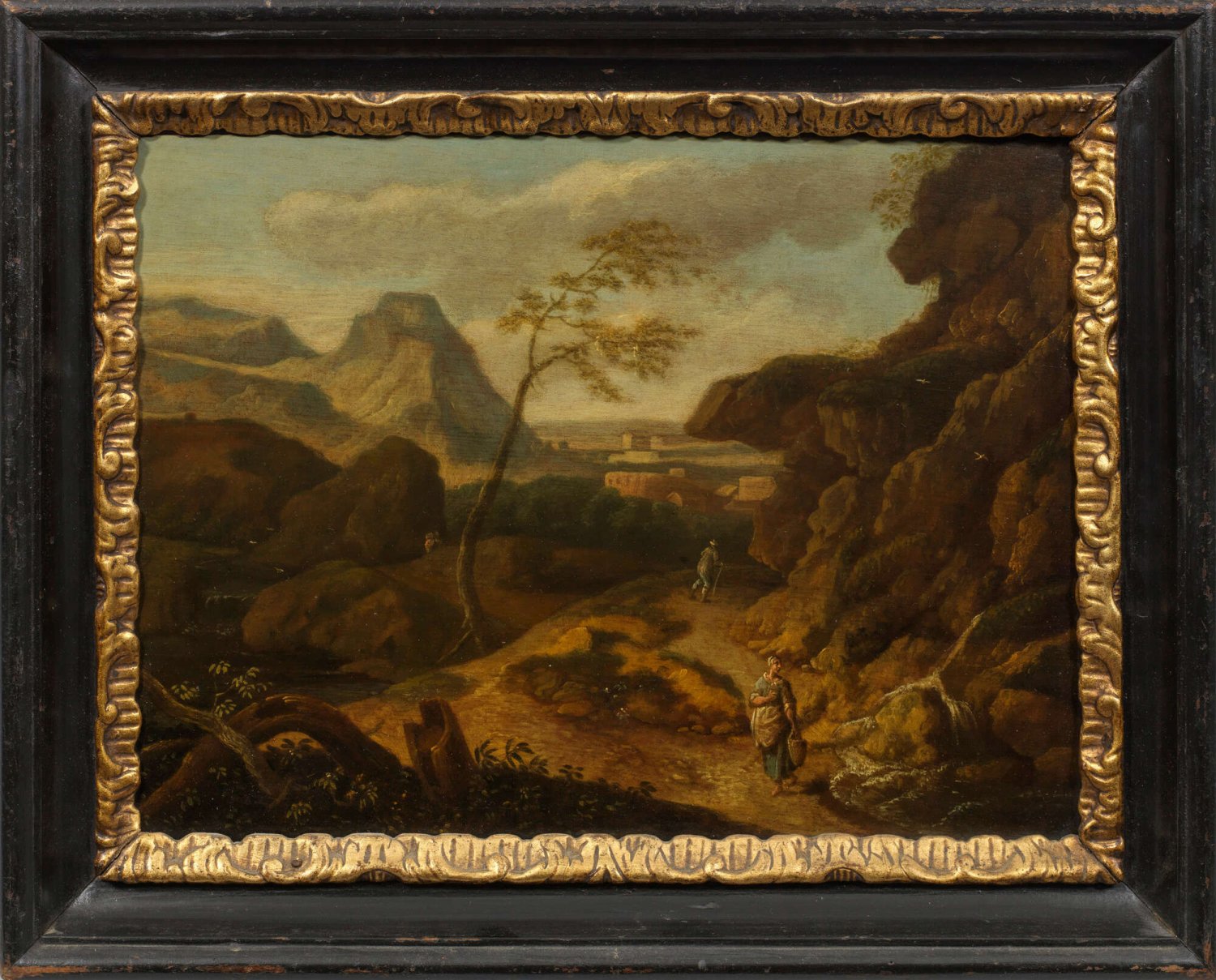 Atmosphärisch gestimmte, italienisierende Landschaft, die den lange anhaltenden Einfluss von Nicolaes Berchem widerspiegelt. Öl/Eichenholztafel. Verso zwei alte Wachs-Siegel mit fürstlichen Wappen. 27,3 cm x 39 cm. Original-Rahmen.
