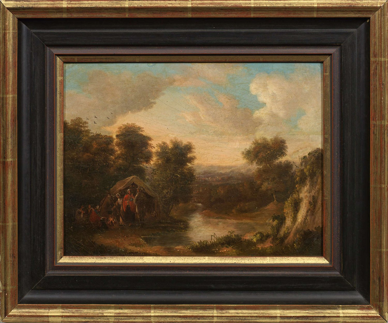 Flusslandschaft mit rastender Gruppe aus dem fahrenden Volk