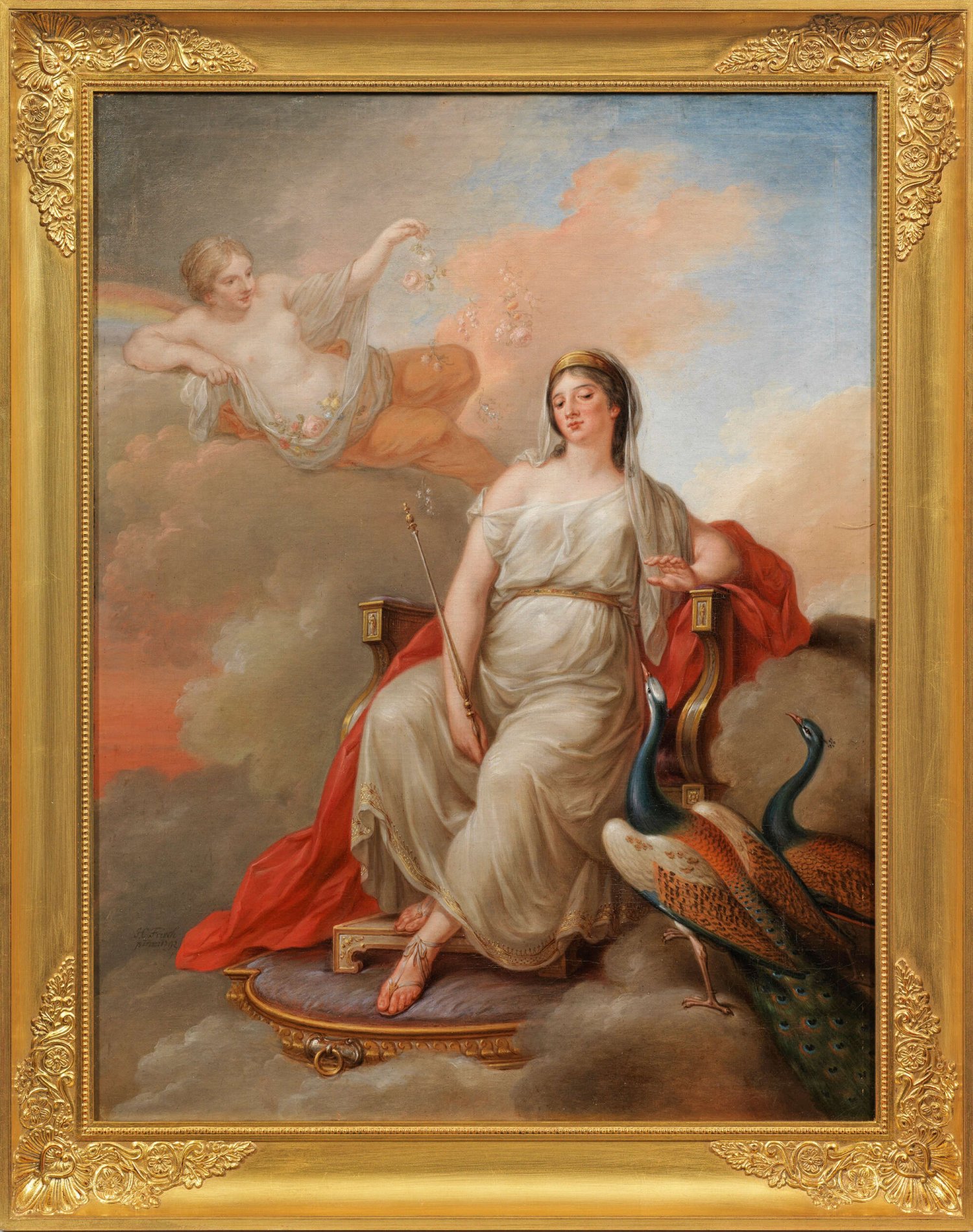 Bei dem Gemälde mit seiner mythologischen Szene handelt es sich zweifelsfrei um das auf der am 22. Mai 1791 eröffneten Berliner Akademie-Ausstellung unter der Nr. 29a gezeigte Werk Frischs, das der Katalog wie folgt beschreibt: "Eine Juno. Die Pfauen, als das Sinnbild des Stolzes, sind nicht, wie gewöhnlich, vor ihren Wagen gespannt, nähern sich aber schmeichel(n)d der Göttin. Aurora streuet derselben Blumen". Das in fein lasierender Malweise ausgeführte, neoklassizistische Gemälde schildert Juno in der Tat ikonographisch außergewöhnlich. Geschickt verhüllt Frisch die Räder des Triumphwagens in verdunkelten Wolken, nur durch eine Ringöse deutet er an, dass die weiß gewandete, mit einem Diadem gekrönte und ein zierliches Zepter haltende Göttin darin sitzt. Diese blickt skeptisch auf die Erde herab, während links oben Aurora als Göttin der Morgenröte zusammen mit einem Regenbogen als Zeichen der Hoffnung auf Frieden geschildert wird. Eine leuchtendrote Partie links könnte als Feuerschein gedeutet werden. Obgleich das Gemälde bereits 1791 ausgestellt war, ist es von Frisch selbst erst 1792 signiert und datiert worden. Wahrscheinlich änderte er nach Ausstellungsende noch Details oder fügte solche hinzu - der Regenbogen und der Feuerschein könnten hierbei auf die Französische Revolution und den Beginn des Ersten Koalitionskrieges (1792-1797) zwischen Frankreich, Preußen und Österreich hindeuten. Frisch wurde als hoch angesehener Maler 1770 Mitglied, 1786 Rektor, 1801 Vizedirektor und 1805 Direktor der Berliner Akademie der Künste. Außer über 30 Bildnissen von König Friedrich Wilhelm II. v. Preußen, Moses Mendelsohn und anderen Persönlichkeiten malte er historische, mythologische und allegorische Szenen, literarische Motive von Lessing und Wieland. Überdies beauftragten ihn Friedrich II. und Friedrich Wilhelm II. mit Wand- und Deckengemälden im Berliner Stadtschloss (1789), Niederländischen Palais (vor 1779), Neuen Palais (1768 und um 1795), in den Neuen Kammern in Sanssouci (1774), im Marmorpalais (1790) und im Schloss Pfaueninsel (um 1796). Öl/Lwd.; L. u. sign. u. dat. 1792. 89 cm x 69 cm. Rahmen.