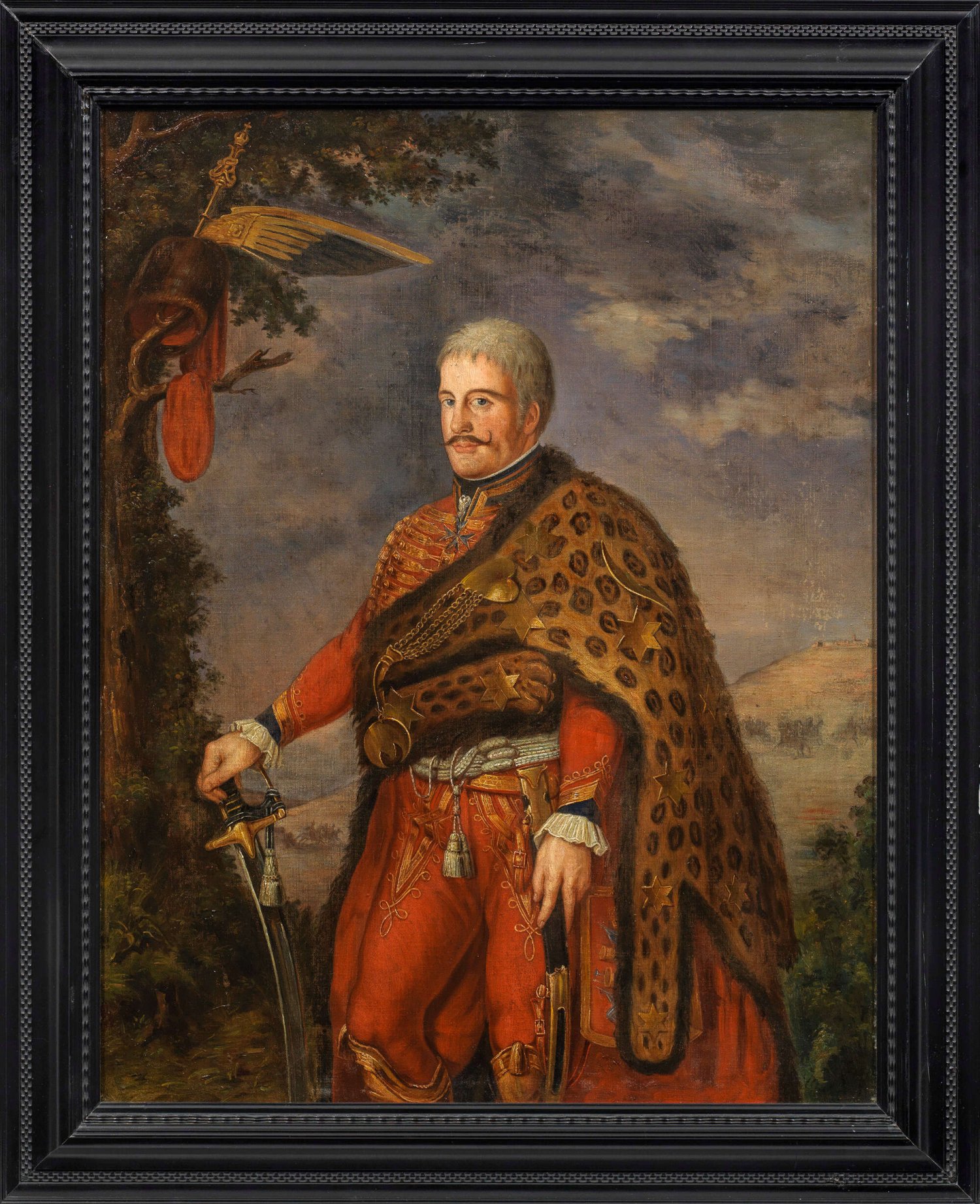 Das repräsentative, als Kniestück komponierte Bildnis stellt Warburg (1765 - 1835) in der Paradeuniform des Husaren-Regiments No. 3 von Goecking (zuvor von Zieten) - der sog. "Zieten-Husaren" - dar. Herausgehoben wird er durch ein Panther- oder Leopardenfell, das so nur von deren Regiments- und Eskadonchefs bis 1806 getragen wurde. Die ebenfalls zur Uniform gehörige, prunkvolle Flügelmütze hängt auf der linken Bildseite am Ast eines Baumes, bei der Blankwaffe handelt es sich um den Husaren-Offizierssäbel, wie er in dieser Form ab 1786 getragen wurde. Am Hals trägt Warburg den ihm 1794 aufgrund seiner Tapferkeit von König Friedrich Wilhelm II. verliehenen Orden Pour le Mérite. Der Dargestellte absolvierte eine beeindruckende militärische Karriere: 1793 trat er als Offizier in das ehemalige von Zietensche Husaren-Regiment "von Zieten" (Brandenburgisches) Nr. 3 ein und nahm als Leutnant am Ersten Koalitionskrieg gegen die Franzosen teil. 1803 wurde Warburg Rittmeister und Chef einer Eskadron, 1805 Major in demselben Husaren-Regiment, 1806 nahm er als Oberstleutnant nach der preußischen Niederlage gegen Napoleon, seinen Abschied. Allerdings übernahm Warburg in den Befreiungskriegen erneut eine führende Position - 1813 gründete er das Mecklenburg-Strelitzische Husaren-Regiment (die sog. "C-Husaren") und nahm bis 1815 an vielen Schlachten teil. 1825 wurde er zum Generalmajor der Kavallerie und zum Brigadekommandeur ernannt. Durch die Darstellung Warburgs als Eskadronchef der "Zieten-Husaren" dürfte das Gemälde in den Jahren 1803-1813 entstanden sein. Die Komposition basiert auf dem berühmten Gemälde des Husarengenerals Hans Joachim von Zieten, das 1769 von Anna Dorothea Therbusch geschaffen wurde und sich heute in Schloss Rheinsberg befindet. Außer der Darstellung des Husarengenerals ist bisher kein weiteres Gemälde eines Offiziers des Regiments in dieser Uniform bekannt geworden. Öl/Lwd.; 80 cm x 63 cm. Rahmen.
