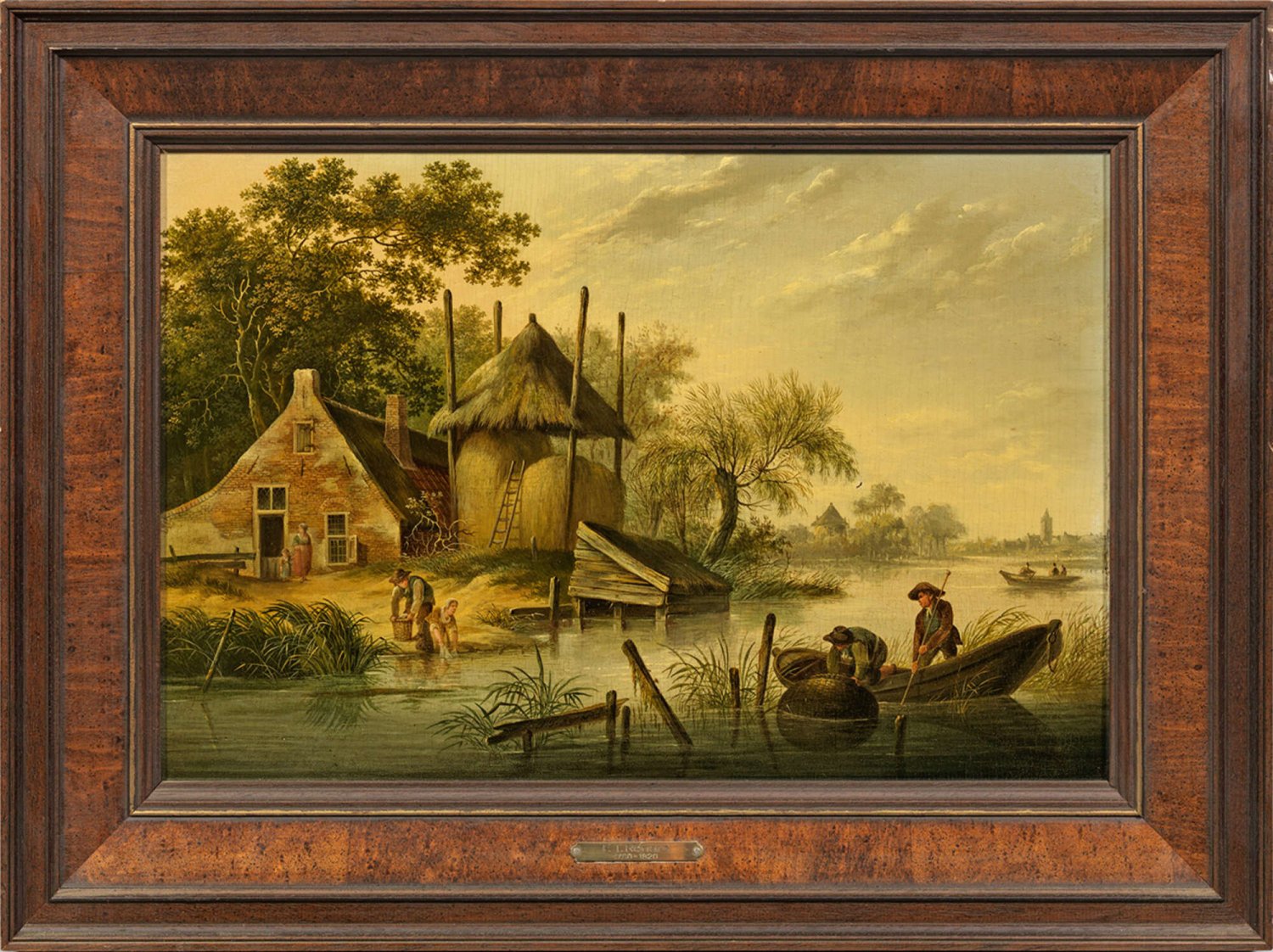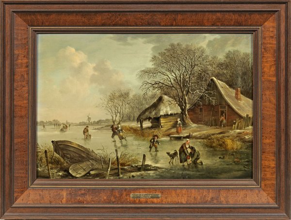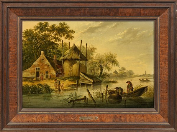 In fein lasierender Malweise ausgeführte, atmosphärisch gestimmte Darstellungen mit Figurenstaffage. Das künstlerisch qualitätvolle Oeuvre des Landschaftsmalers umfasst neben Veduten und einigen Pendants wie diesem vornehmlich winterliche Flussmotive in der Tradition des 17. Jhs.; Öl/Eichenholztafel. Das Gemälde mit Sommerlandschaft m. u. am Brett sign.; 31 cm x 45 cm. Rahmen.