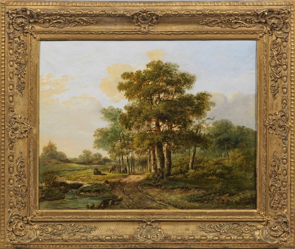 Fein gemalte, morgendlich gestimmte, atmosphärische Landschaft mit einem unter Eichen sitzenden, jungen Hirten. Ein auch in diesem Gemälde wiederkehrendes Hauptmotiv im Oeuvre Koekkoeks sind große alte Eichen, die mit ihren bizarren Stämmen und Ästen in den Himmel ragen. Der an der Amsterdamer Kunstakademie ausgebildete Maler ging 1834 nach Kleve, wo er 1841 eine eigene Akademie gründete. In der Region inspirierten ihn die umgebenden Landschaften und der Reichswald zu feinfühlig erfassten Kompositionen wie dieser. Koekkoek wurde seit 1829 vielfach mit Auszeichnungen geehrt und gilt als einer der bedeutendsten und erfolgreichsten Landschaftsmaler des 19. Jhs. von internationalem Renommée. Öl/Lwd., doubl.: Sign.; Rest.; 55 cm x 68 cm. Rahmen.