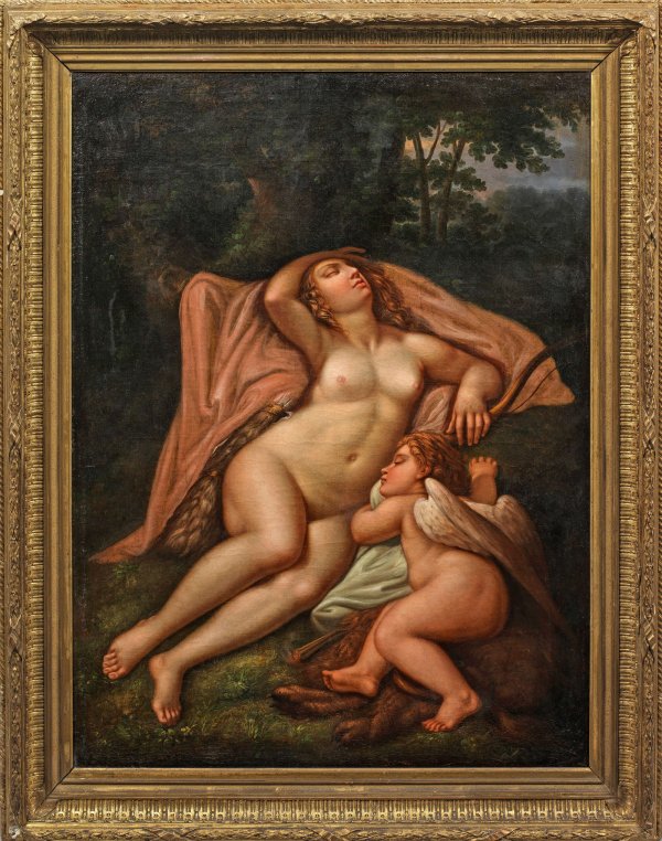 Szenische Darstellung der schlafenden Venus als Aktfigur mit Amor in einer bewaldeten Landschaft. Die Komposition des künstlerisch qualitätvollen, wohl in der 1. Hälfte des 19. Jhs. in Frankreich entstandenen Gemäldes basiert auf dem berühmten, um 1524-1528 geschaffenen Werk Antonio da Correggios, das sich im Louvre in Paris befindet, wobei der Satyr auf der linken Bildseite weggelassen wurde. Nachdem die Szene lange als "Jupiter mit Antiope" identifiziert wurde, stellt sie nach neuerer Forschung Satyr, Venus und Amor dar. Öl/Lwd.; 110 cm x 83,5 cm. Rahmen.
