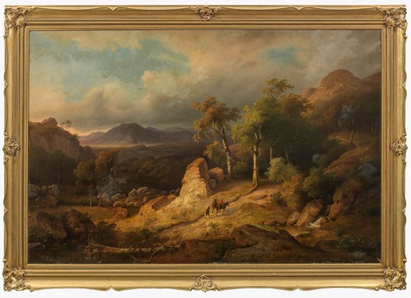 Imposante, spätromantische, wohl im Harz entstandene Landschaft, die sich in Motiv und Stil überzeugend in das frühe Oeuvre Edmund Kokens einordnen lässt. Koken studierte ab 1836/37 an der Akademie in München, wo ihn - wie es auch in diesem Gemälde augenfällig ist - insbesondere Carl Rottmann nachhaltig beeinflusste. Schon 1836 debütierte er in der Frühjahrsausstellung des Hannoverschen Kunstvereins, 1841 kehrte Koken nach Hannover zurück und schilderte mit Vorliebe poetische, bewaldete Gebirgslandschaften, u. a. aus dem Südharz mit der Klosterruine von Walkenried. Öl/Lwd.; R. u. undeutl. sign. u. dat. (18)43. 120 cm x 185 cm. Rahmen.
