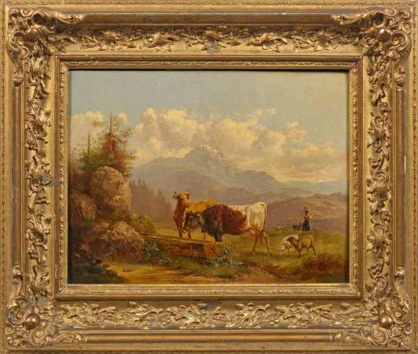 In feinflüssiger Malweise ausgeführtes, künstlerisch herausragendes Werk des Malers mit subtil geschilderter, atmosphärisch gestimmter Landschaft und lebendig wiedergegebenen Tieren. Voltz galt als der bedeutendste deutsche Tiermaler seiner Zeit und Meister des idyllischen Genre- und Tierstücks. Öl/Holztafel. L. u. monogr.; 26 cm x 34 cm. Rahmen.