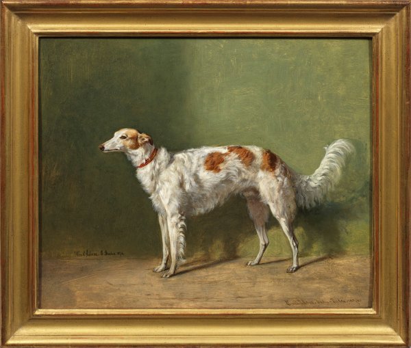 Höchst lebendig geschildertes, feinmalerisch ausgeführtes Tierbildnis mit meisterhafter Darstellung der Fellzeichnung. Adam, Spross der bedeutenden Münchener Künstlerdynastie, zeigte als Tiermaler früh ein künstlerisches Talent für Pferdeporträts. Seit 1860 erhielt er zahlreiche Aufträge aus dem Hochadel, die ihm europaweit einen Ruf als bester Maler von Rasse- und Rennpferden einbrachten. 1878 malte er u. a. die Stute "Kincsem", das erfolgreichste Rennpferd aller Zeiten, welches im selben Jahr den Großen Preis von Baden-Baden gewann. Bei seinem für 1878 dokumentierten Aufenthalt in Baden-Baden entstand auch dieses Bildnis eines Barsoi - dem Lieblingshund des russischen Adels zur Zarenzeit, welche die Stadt im 19. Jh. als beliebte Sommerresidenz erkoren hatte. Öl/Mahagonitafel. R. u. sowie l. u. zweifach sign. u. dat. 1878 mit Ortsangabe Baden-Baden. 37 cm x 45 cm. Rahmen.