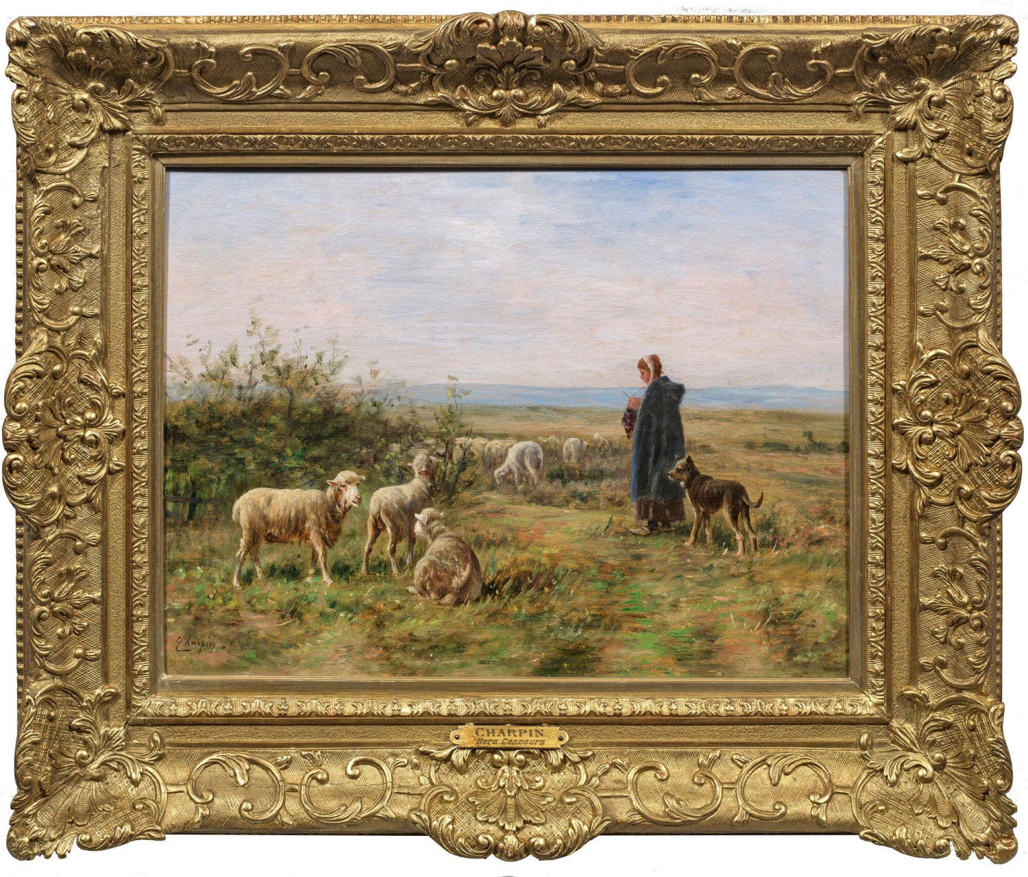 Morgendlich gestimmte, in hellem, pastelltonigem Kolorit gemalte, impressiv aufgefasste Darstellung. Charpin, ein Schüler von Charles-François Daubigny gehörte zur Schule von Barbizon. Mit Vorliebe malte er ohne Idealisierung Menschen im selbstverständlichen Einklang mit den Tieren und der Natur in ursprünglich wirkenden Landschaften, oft mit einer Hirtin und ihrem Schutzhund, die sich um Tiere, Kühe oder Schafe kümmern. Öl/Lwd.; L. u. sign.; 39 cm x 55,5 cm. Rahmen.